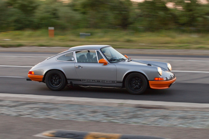 La base est une 911 T de 1970, qui reçoit une 3,2 l entre ses ailes arrières, et une boite de SC se charge de passer les watts aux roues arrières. Le Flat 6 chante dans une double sortie d’échappement. Les liaisons au sol sont confiées à Bilstein pendant que Tarox se charge du freinage. Aux 4 coins, de classiques Minilite (Ca change des Fuchs!) sont recouvertes de noir et chaussées en Yokohama. Pour compléter et terminer le tableau, un intérieur full Rennline associé à un volant Momo.