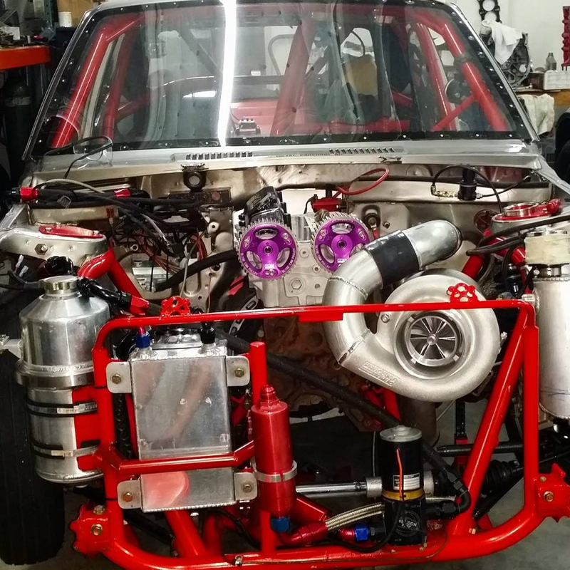 La vintage et petite propu de chez Toy reprend la même base mécanique que sa cousine Corolla, un 3SGTE. La caisse a été assemblée et préparée chez PSI Racing à Miami. Spécialiste du drag, la Starlet a subit sa mutation dans le but d’aller pourfendre du 400m. Au programme, tornade sous le capot, wheelies bars, pneus arrière qui remontent jusqu’au milieu des vitres, baquets anti-tâches, burnes bien accrochées et autour de 7 secondes départ arrêté !