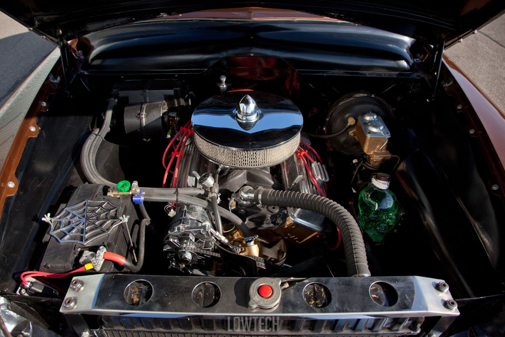 Le résultat, vous l’avez qui défile sous vos yeux ! La Ford est complètement reconstruite… Toujours sur airride, des Ridetech Air Ride Technologies. Le 6 en ligne est transformé en machine à coudre et le capot reçoit un V8 GM 350ci. Une robe Walnut Brown, l’intérieur est revu de fond en comble… ça parait simple comme ça, mais sachez que l’ensemble a nécessité 6 ans de boulot !