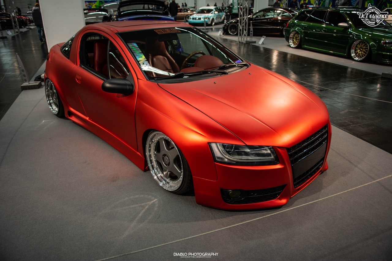 L’Essen Motor Show, c’est le SEMA européen. A moins que le SEMA soit l’Essen américain…! J’vous laisse le mettre dans l’sens qui vous va le mieux. Dans tous les cas, d’un côté comme de l’autre, on tutoie du lourd en terme de prépa et modifs… esthétiques ! Oui, c’est flagrant l’Europe n’a rien à envier… même si finalement, les gros projets européens sont directement inspirés de ceux qui ont flashés aux U.S. Mais bon, on ne va pas se plaindre, au contraire.