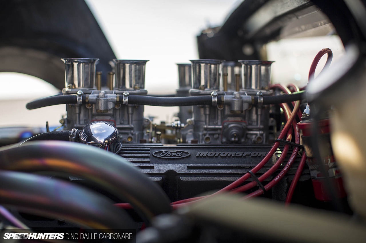 Derrière, pas de V12 transversal élevé à Sant’Agata Bolognese. Un bon V8 ricain Ford Motorsport de 308 ci, revu par Kato San, gavé aux Weber et qui doit hurler ses morts à travers une ligne complète aussi libre que belle, signée Wolf. A lui seul, le collecteur est une véritable pièce d’orfèvrerie !