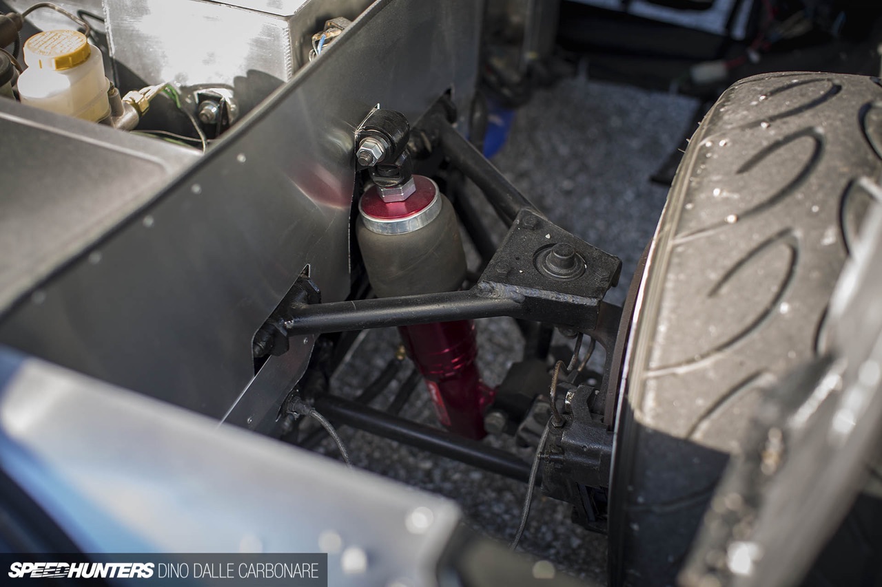 Le châssis a simplement été revu en recevant de nouveaux triangles et une suspat’ IdealAir (oui, du airride). Il et ensuite posé sur des SSR MKIII en 10 x 15″ devant et 12 x 15″ derrière, chaussées en semi slicks Yokohama Advan A050, respectivement de 205 et 225. Histoire de régler le fitment et de coller à la largeur du monstre, sachez juste qu’à l’arrière malgré leur 12″ de large, les jantes ont un ET de -60 et sont posées sur des cales de 90 mm… Ah y’a de la largeur de voie là !