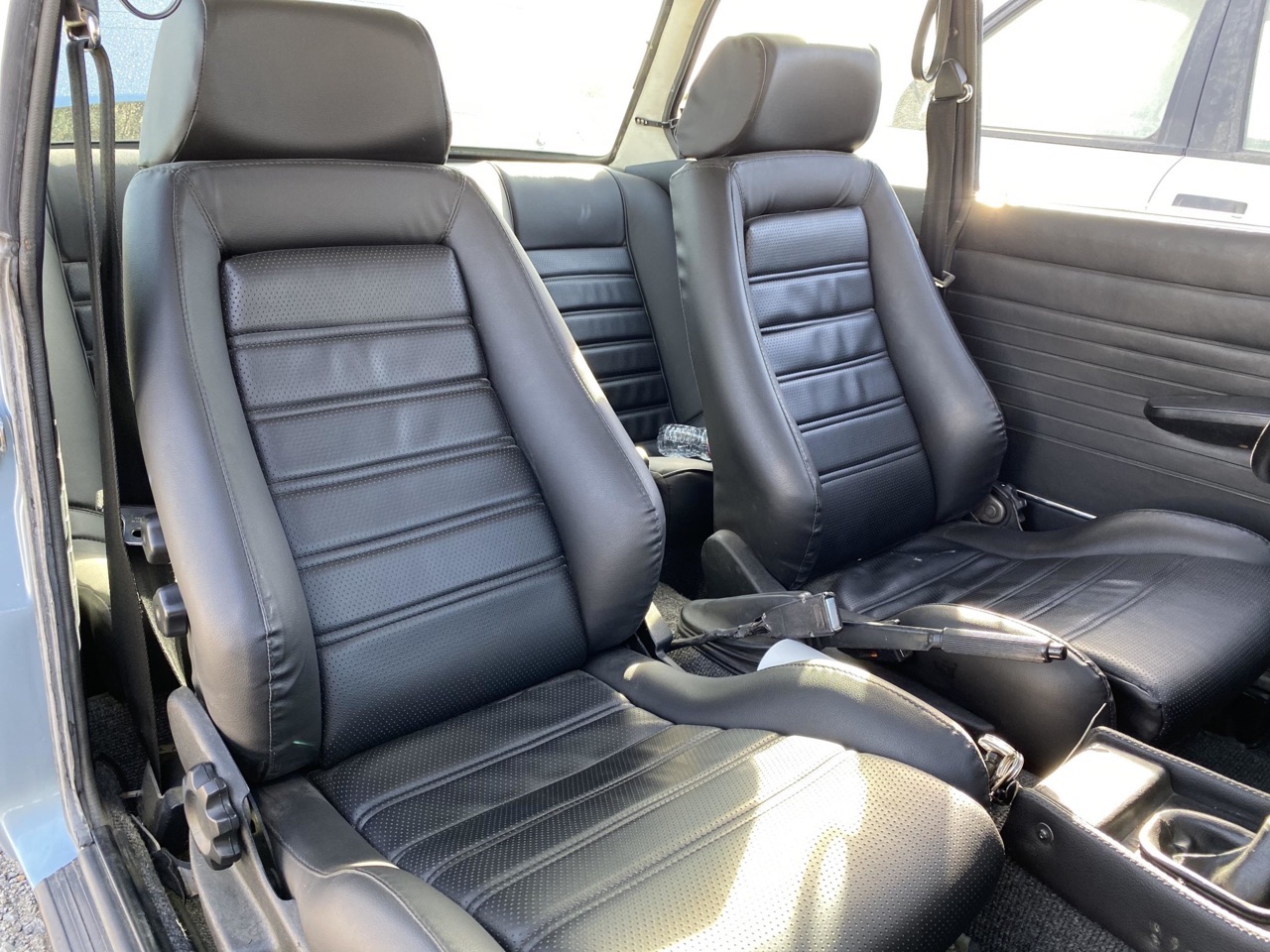 Pour commencer la caisse a été refaite. Ses ailes ont été rabotées afin d’accueillir les extensions et à l’avant, une lèvre est venue amplifier son agressivité. Le bon Turbo Look des familles ! Mais ça lui va tellement bien. Histoire de peaufiner le style, on retrouve le petit baquet ducktail sur le coffre, un petit pare-choc chromé à l’arrière et le deux antibrouillards positionnés de chaque côté de la célèbre (et regrettée !) calandre à double haricots. La tôle est ensuite habillée en Fjord Blue, la même teinte qu’elle avait le jour de sa sortie d’usine.