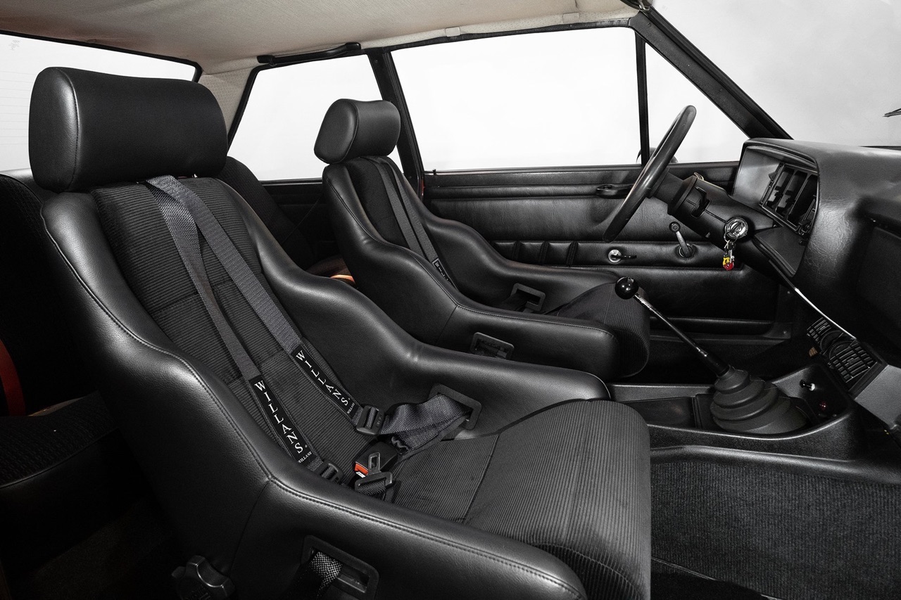 Tout ça c’est bien, mais si c’est pour se vautrer au premier virage venu… et on est pas loin de la vérité. D’origine, la 131 n’a qu’un seul atout… sa propulsion. Pour le reste, c’est pont rigide ! Abarth va tout revoir en y adaptant les solutions appliquées sur la 124 Rallye. Du coup, on vire le pont pour y mettre une suspension à roues indépendantes, et les quatre roues passent en double triangulation avec combinés ressort / amorto et barre anti-roulis réglable à l’arrière ainsi qu’à l’avant où elle est plus grosse et montée sur rotule. Pour finir le tableau, le freinage se contente de quatre disques en 227 mm, ventilés à l’avant et planqués derrière des Cromodora en 14″ chaussées en Pirelli en 185/60.