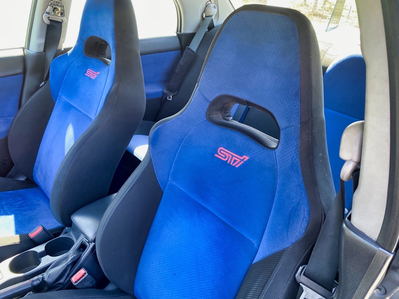 Dans l’habitacle, les baquets STi à sellerie biton sont toujours présents. Des manos supplémentaires permettent de veiller à la bonne santé du 6 en ligne, et on retrouve un volant Momo et un pommeau Tomei. Pour le reste, rien ne laisse vraiment présager le potentiel de l’engin même si les amateurs savent bien qu’une Impreza STi 8 c’est plus difficile à trouver d’origine que préparée.