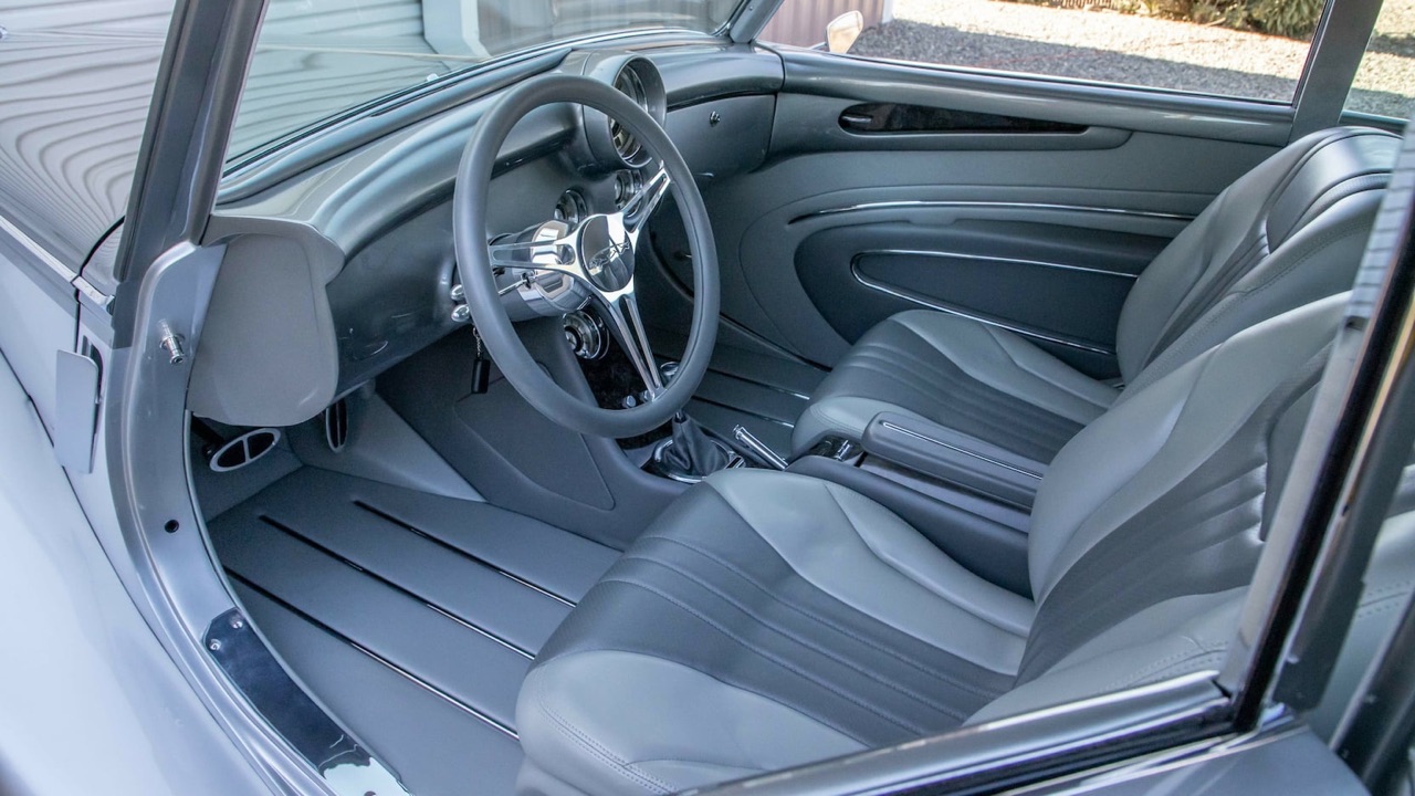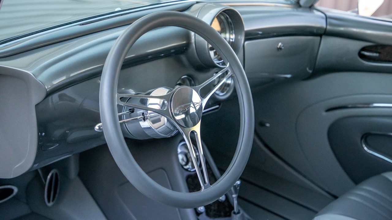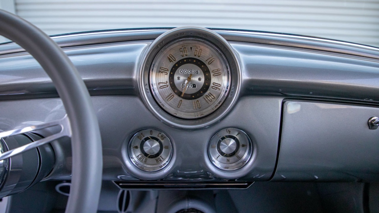 La caisse a été refaite, modifiée, choppée, lissée, débarrassée des pare-chocs avant, équipée de petits feux arrière… et habillée d’une robe biton métallisée en haut et satinée en haut. Les photos parlent d’elles mêmes, c’est classe et ça claque. Et c’est pareil dans l’habitacle, signé du spécialiste Ron Mangus. Un véritable cocon avec sièges et vitres élec, clim, direction assistée, sono à vous faire saigner les tympans, un tableau de bord de Buick 1950 rhabillé comme il se doit, le tout tendu de cuir et de chrome, de quoi rendre jalouse la première Bentley qui passe !