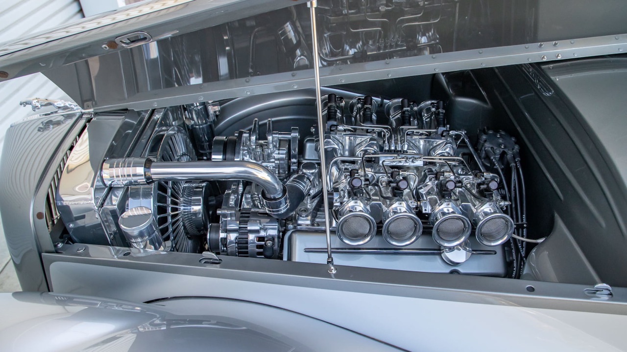 Paisiblement installé, le « pilote » et ses passagers – puisque la MkV, bien que passée en coupé, a conservé sa banquette arrière – profitent de l’allonge d’un V8 Chevy de 350 ci entièrement chromé, passé à l’injection, avec admission par papillons et libéré via une ligne complète inox sur mesure. Il baigne dans un shaved bay exemplaire.