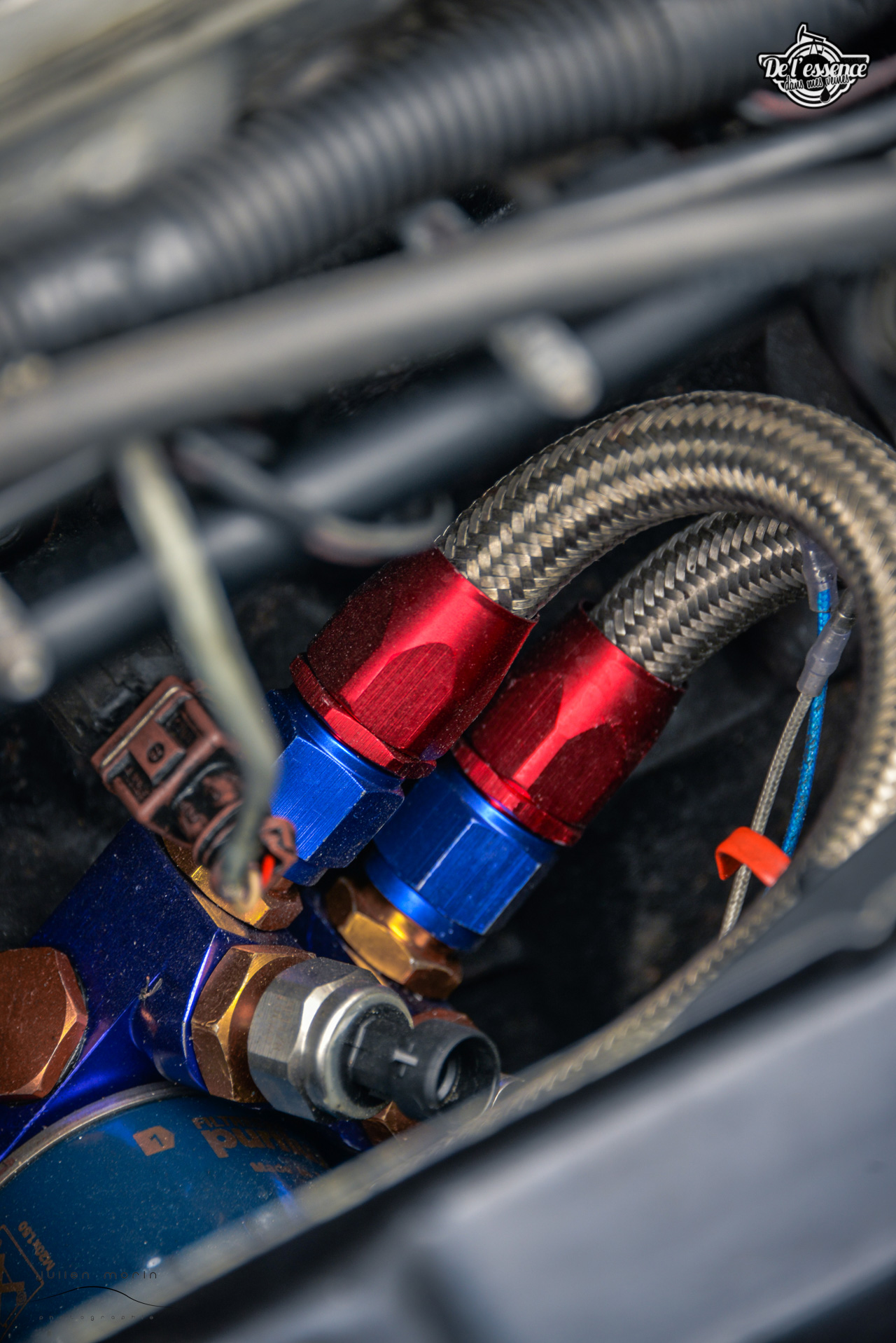 Le swap se fait aux forceps. La pipe d’admission vient toucher le capot lors des grosses accélérations. Le phare a dû être découpé pour laisser de la place à la poulie d’alternateur. La batterie a migré dans le coffre. La ligne full inox est réalisée sur mesure. Le faisceau complet est remplacé. Et des « détails » comme ça, il y en a une liste complète.