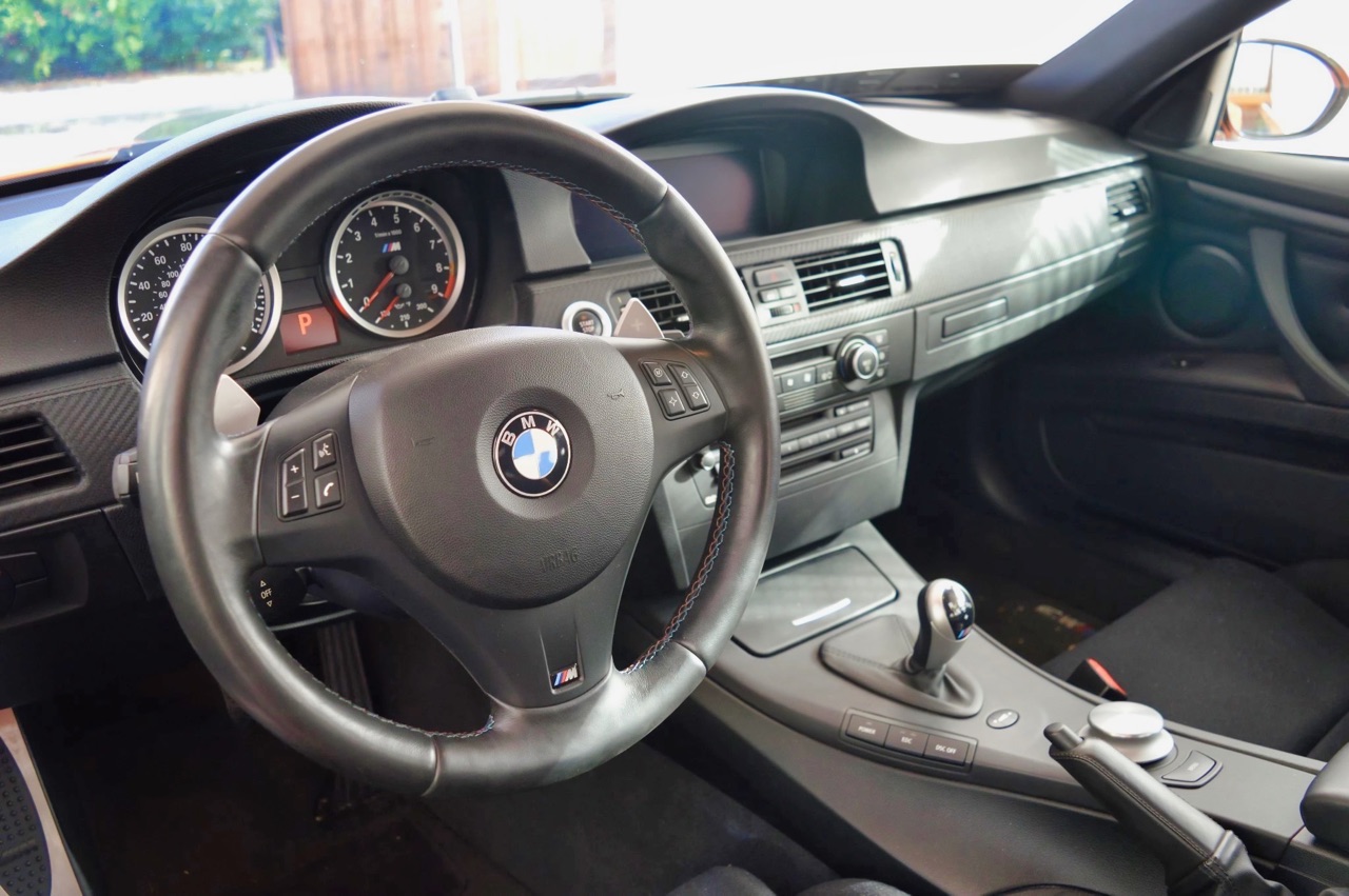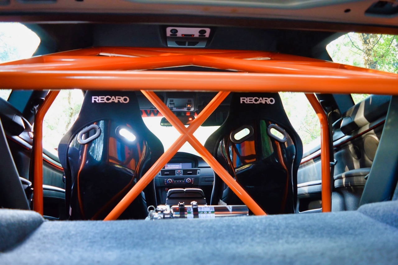 Celle qui nous intéresse aujourd’hui semble échappée de Sebring ou de Road America. Passée par les ateliers de chez Eurotech Motorsports, elle a reçu un méchant kit full carbone Flossman ALMS GT2 venu tout droit d’Allemagne. Visuellement, c’est plutôt violent… extensions XXL avec prises d’air derrière les ailes avant et arrière, avant largement aéré et énorme aileron surplombant les fesses. Pour finir, un covering orange reprenant les trois bandes de M Motorsport. Le contraste vient de films jaunes qui viennent habiller les phares. Pour coller au bitume, la M3 est dorénavant maintenue par des combinés KW et chaussée en Aristo de 20″ enrobées de Toyo Proxes T1R. Le freinage d’origine est jugé suffisant.