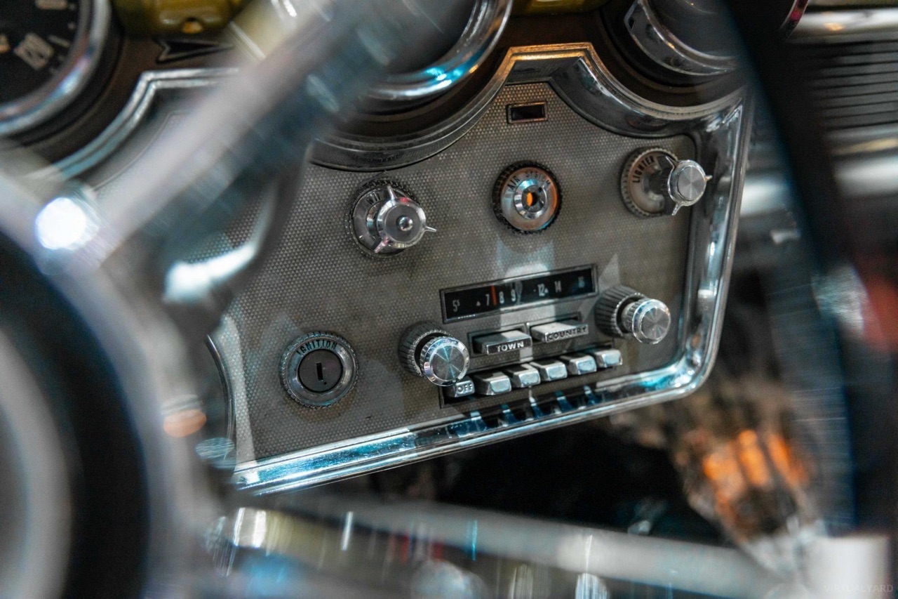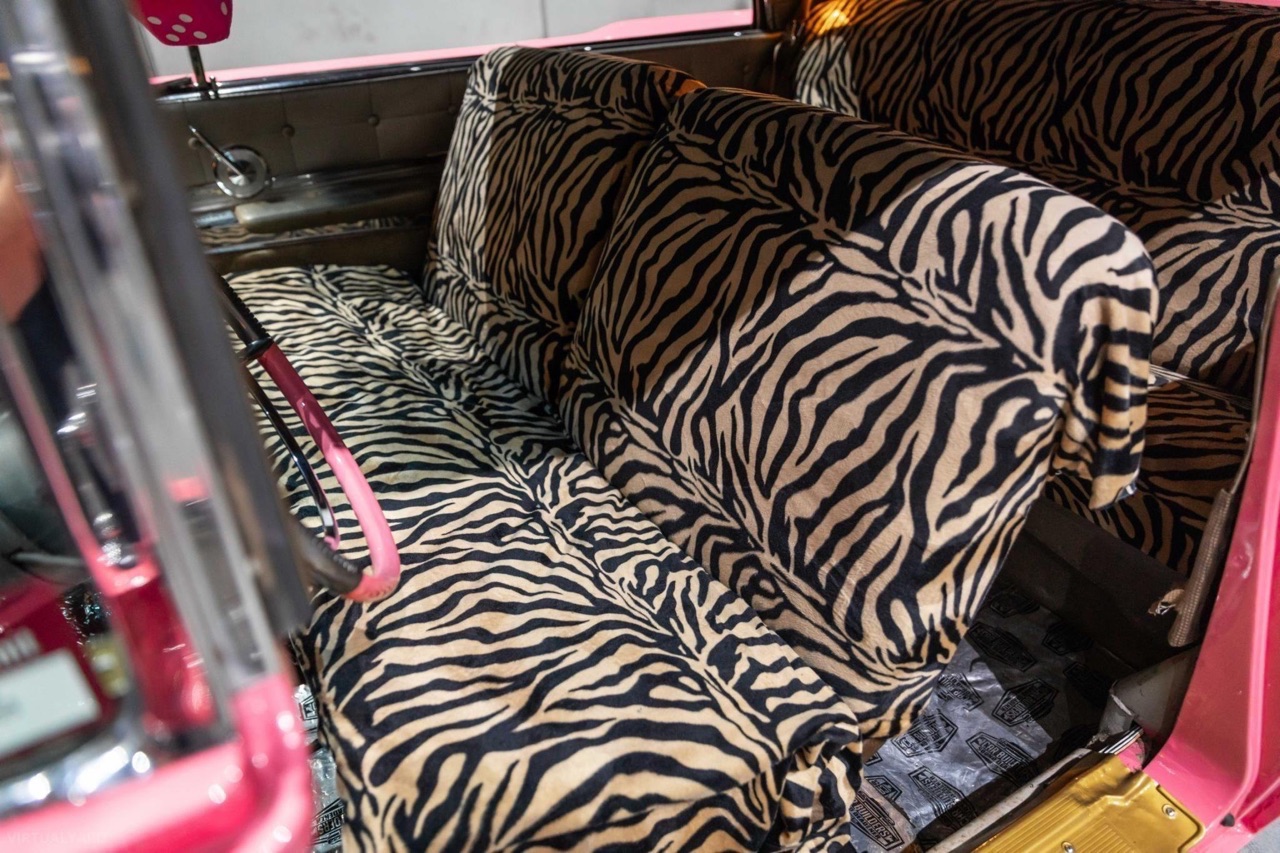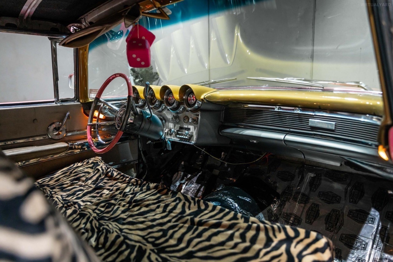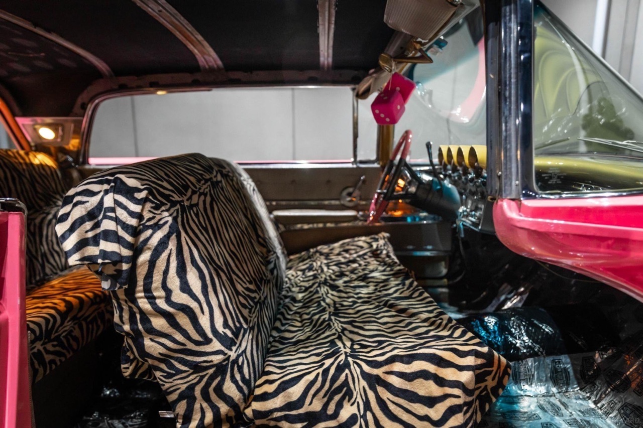 Posée sur des airbags Accuair, ses ailes sont maintenant remplies par des jantes tôles Detroit Steel Wheels en 20″, reprenant la teinte de la caisse avec un enjoliveur central chromé. Sous l’capot, le V8 de 430 ci a gardé sa place. Il a juste été refait à neuf et… maquillé ! Dans l’habitacle, c’est 70’s show ! Pas de revival ou de gadgets électroniques. Seulement le dessus du tableau de bord dorée, et des banquettes maintenant recouvertes d’un plaid zébré.