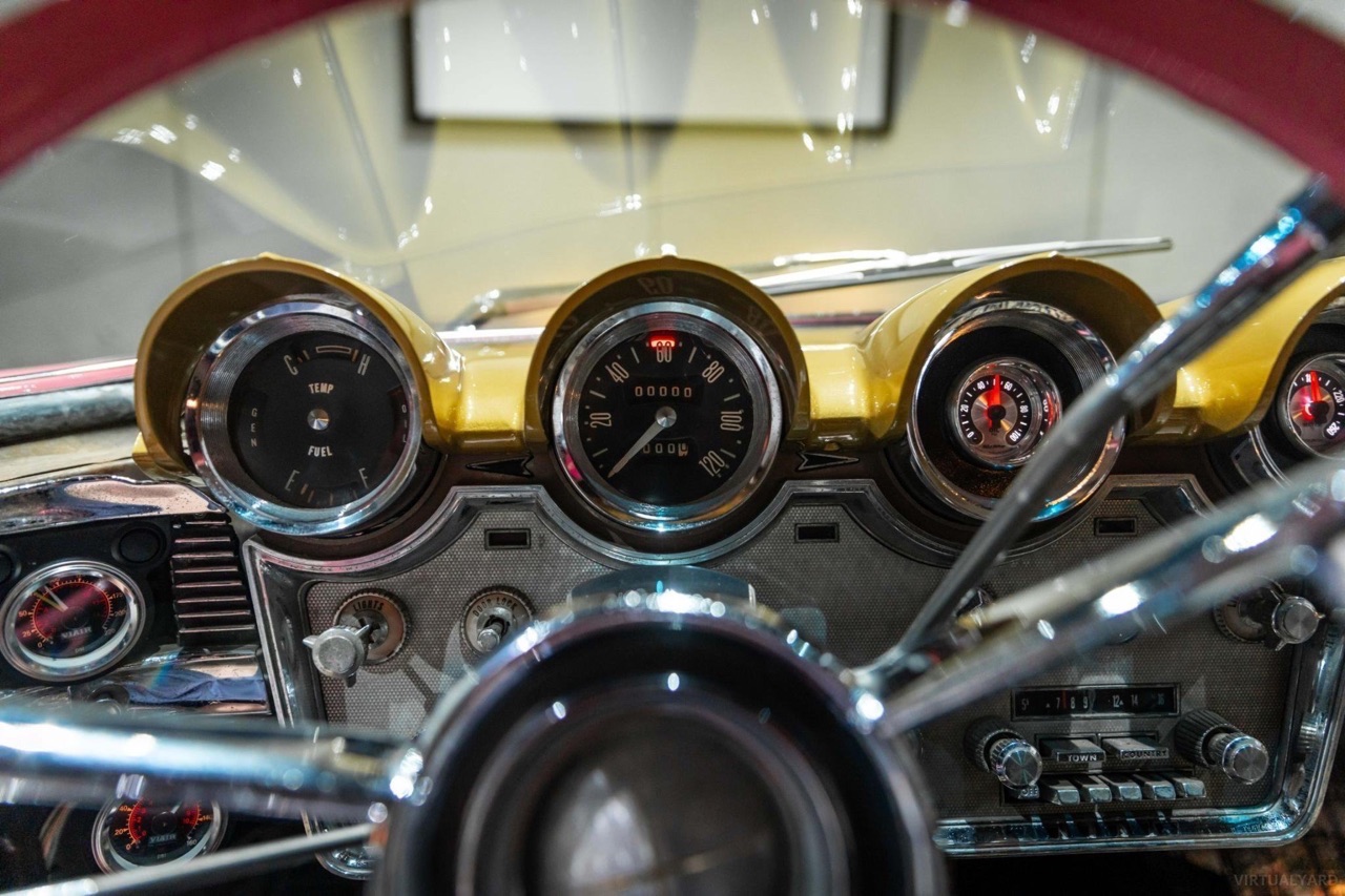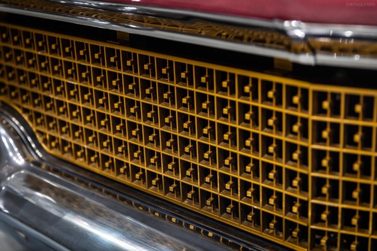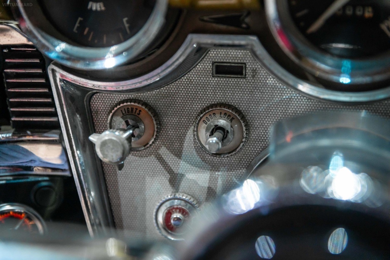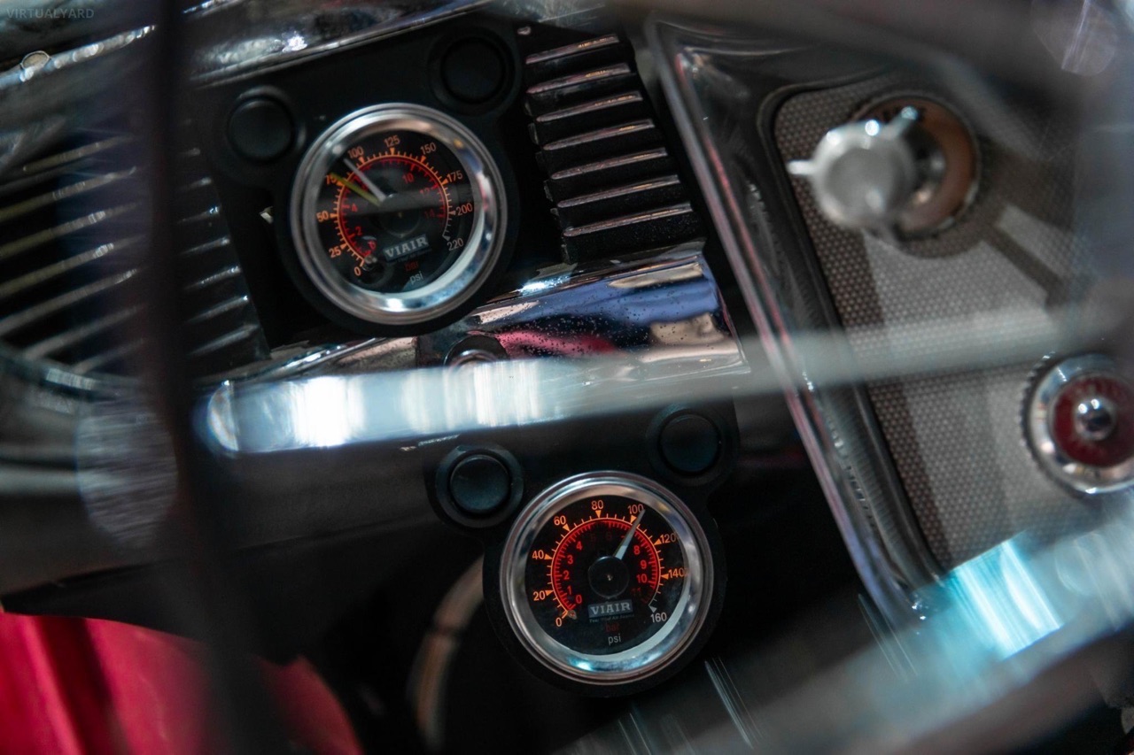 Posée sur des airbags Accuair, ses ailes sont maintenant remplies par des jantes tôles Detroit Steel Wheels en 20″, reprenant la teinte de la caisse avec un enjoliveur central chromé. Sous l’capot, le V8 de 430 ci a gardé sa place. Il a juste été refait à neuf et… maquillé ! Dans l’habitacle, c’est 70’s show ! Pas de revival ou de gadgets électroniques. Seulement le dessus du tableau de bord dorée, et des banquettes maintenant recouvertes d’un plaid zébré.