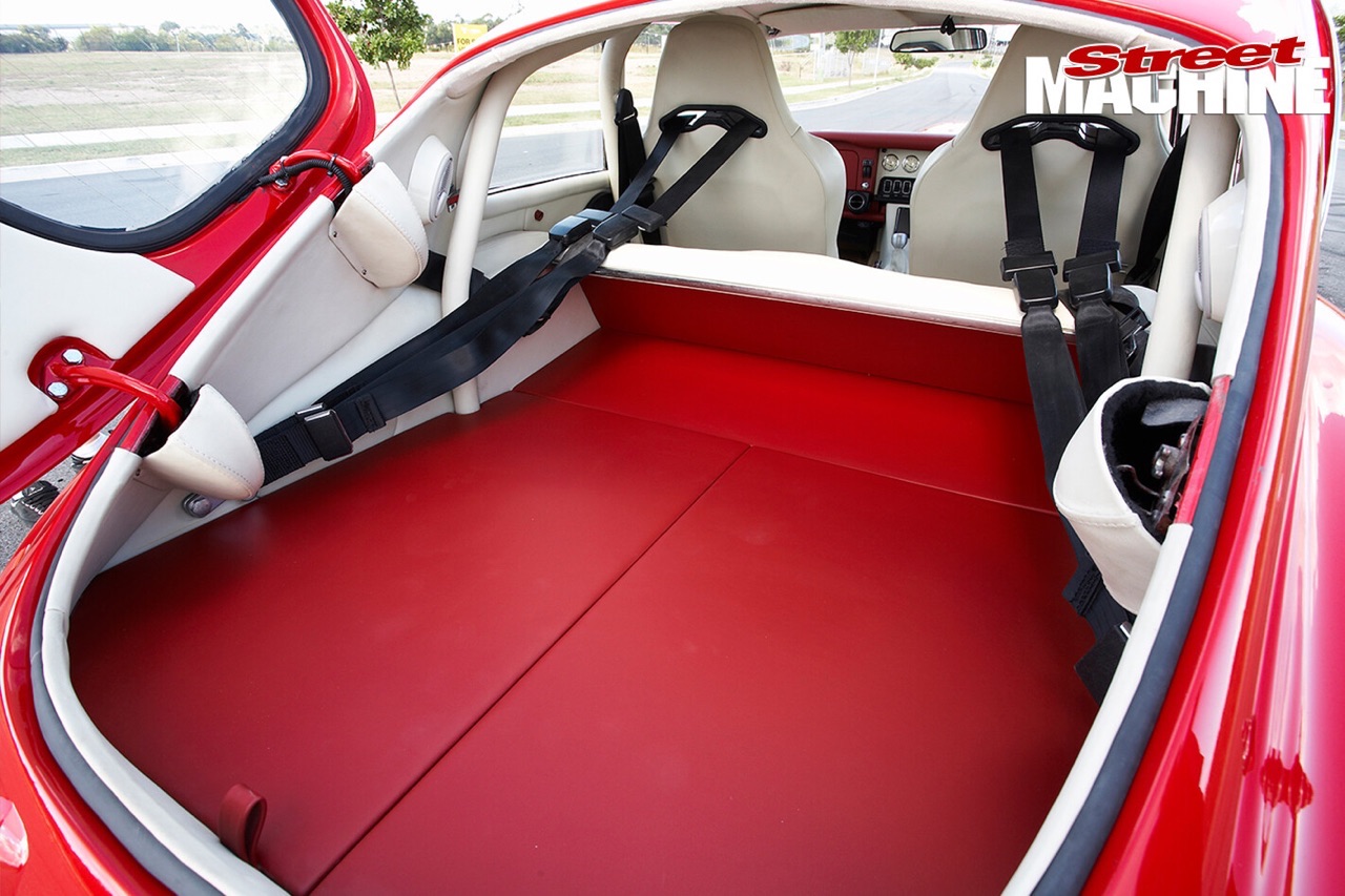 Quoiqu’il en soit, Geoff a confié son anglaise à l’équipe d’OZ Rods en leur demandant de lui pondre une caisse au niveau de son esthétique qu’il ne fallait absolument pas toucher mais avec au moins 500 ch aux roues et fiable. Dit comme ça, ça parait simple. Après 12 mois de boulot, c’est la bestiole rouge qui défile sous vos yeux qui est sortie des ateliers de Brisbane.