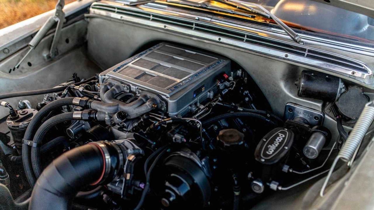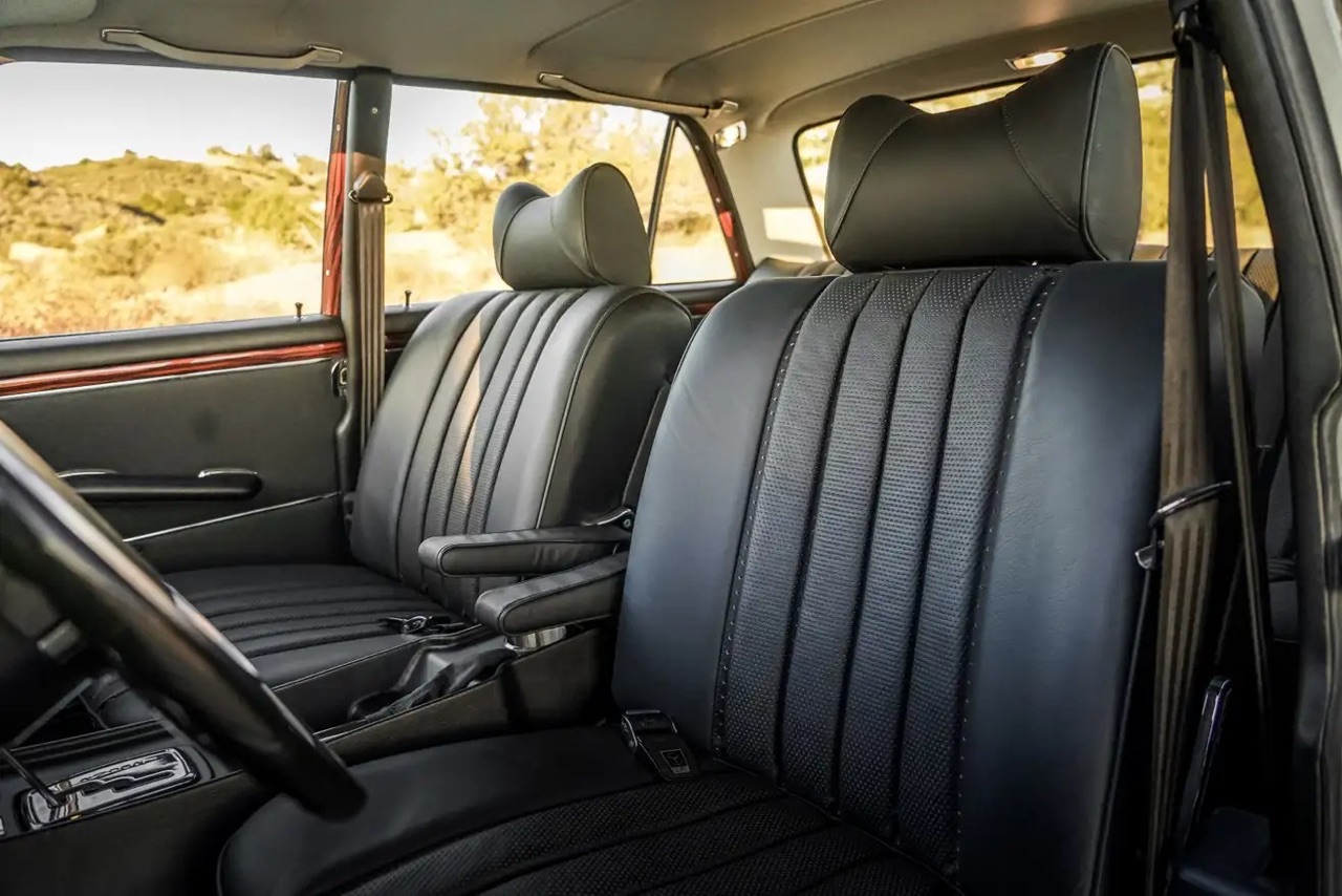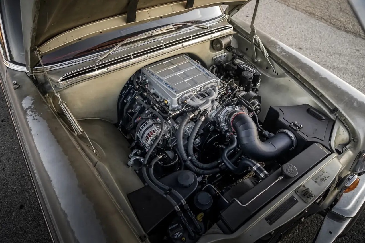 Aujourd’hui, ils font donc un come back fracassé et fracassant avec cette Mercedes 300 SEL qui, sous ses airs de berline ringarde cache des dessous et une mécanique qui rendraient jalouse une AMG moderne. Tout part d’un châssis Art Morrison équipé de roues indépendantes avec trains multibras, des coilovers réglables et un freinage Brembo équipé d’étriers 6 pistons devant et 4 derrière et alimenté par un servofrein Wilwood. Il est posé sur des jantes EVOD Industries en 18″ en alu usiné dans la masse et reprenant le style de celles d’origine avec l’enjoliveur étoilé qui va bien ! Entre les roues avant, un V8 LS9… comprenez par là, le 6.2 l dopé par un compresseur Eaton qui équipait la C6 ZR1. Il est associé à une boitoto 4 vitesses Chevrolet 4L85E reconstruite et renforcée afin d’encaisser les 638 ch et 819 Nm de couple.