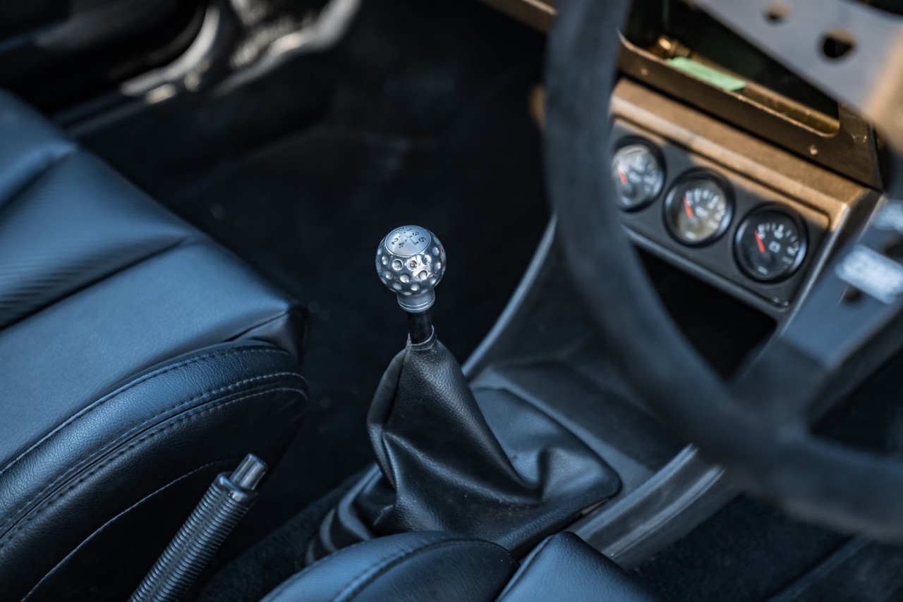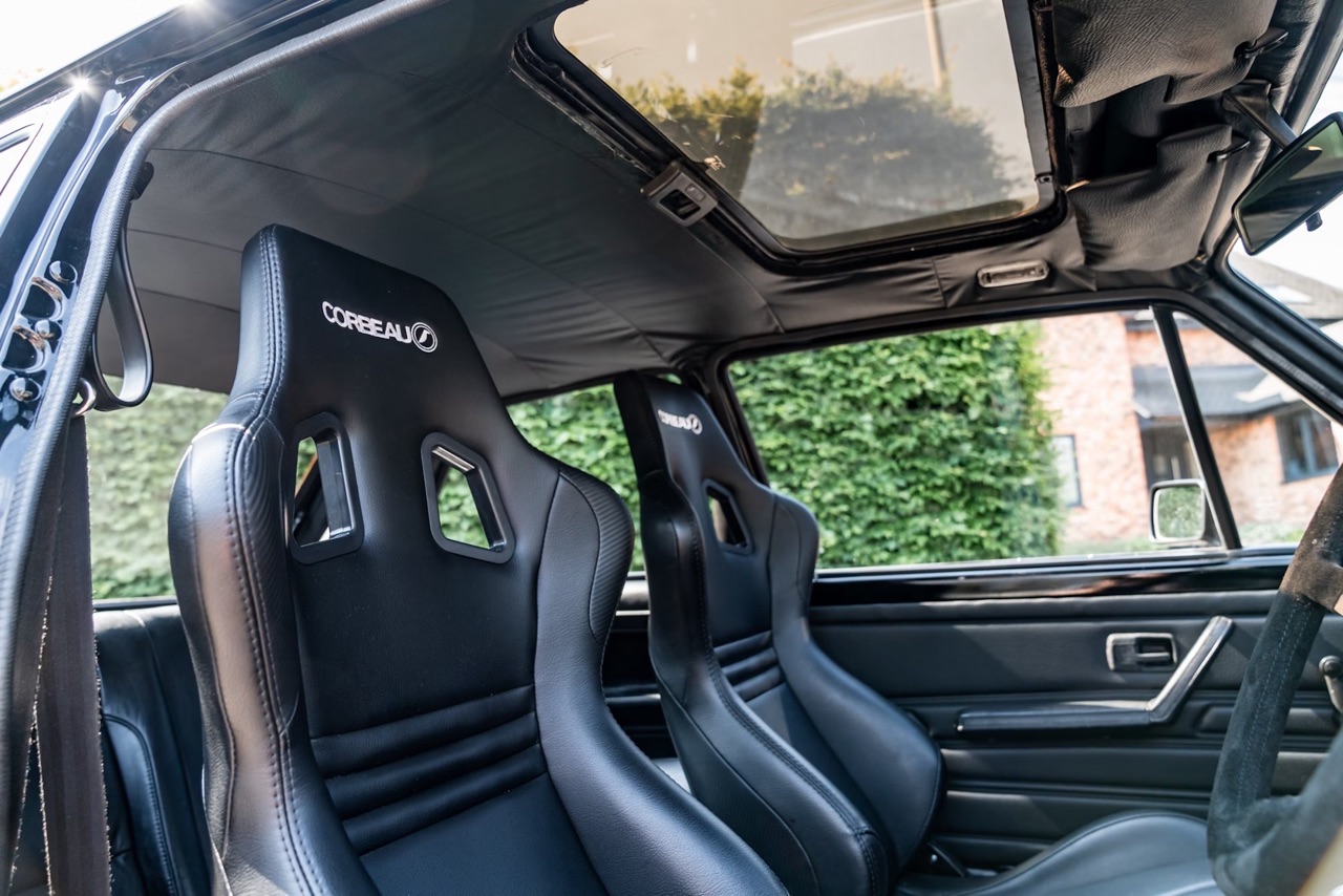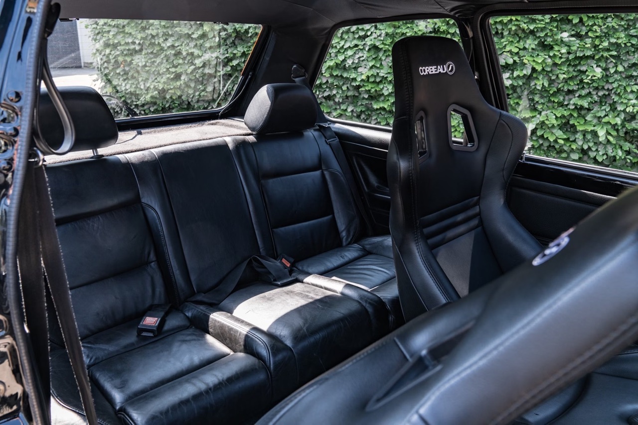Comme d’hab, on termine sur l’habitacle. Pour coller au nouvel esprit de la teutonne, on y retrouve un jeu de baquets Corbeau en cuir noir. La banquette d’origine a laissé sa place à celle d’un coupé Scirocco. Elle aussi s’affiche en cuir noir. Quelques touches de carbone look, un volant tulipé OMP, le célèbre pommeau « balle de golf » repeint en argent, et la boucle est bouclée.