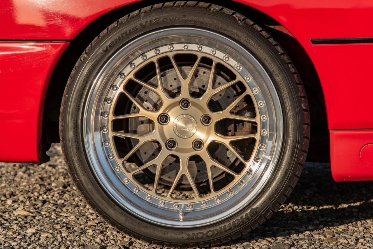 D’ailleurs pour tenir le bitume, les suspensions sont passées en amortos TRW et ressorts courts H&R. Le freinage fait confiance à des disques percés, mordus à l’avant par des étriers empruntés à une CSi et alimentés par des durites avia. Aux quatre coins, des jantes forgées BC trois parties chaussées de boudins Hankook Ventus V12 Evo2 en 245/30 devant et 305/30 derrière.