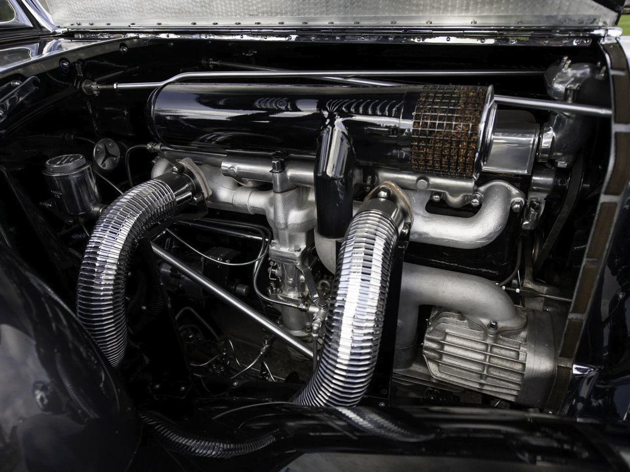 Présentée au salon de Paris 1936, la 540K est une évolution de la 500K. Dessinée par Friedrich Geiger le principe était le même. Un châssis, plusieurs dimensions, et la caisse au choix. Cabriolet, coupé, berline, deux ou quatre places. Au niveau du 8 en ligne, il prenait du volume en passant à 5.4 l, toujours accompagné de ses deux gros compresseurs et du compresseur Roots. Le fonctionnement était simple. A usage normal, il restait en atmo. Lorsque qu’on soudait, un palier sur l’accélérateur permettait d’enclencher le compresseur. Et pour les plus nerveux, ils pouvaient également le faire manuellement directement depuis une manette située dans l’habitacle. Une fois enclenché, il permettait de sortir 180 ch qui partaient vers les roues arrière via la boite 4 manuelle alors qu’un 5ème rapport était disponible en option. Notez que le châssis avec profité du savoir faire de la compétition pour gagner en rigidité tout en économisant un bon paquet de kilos.