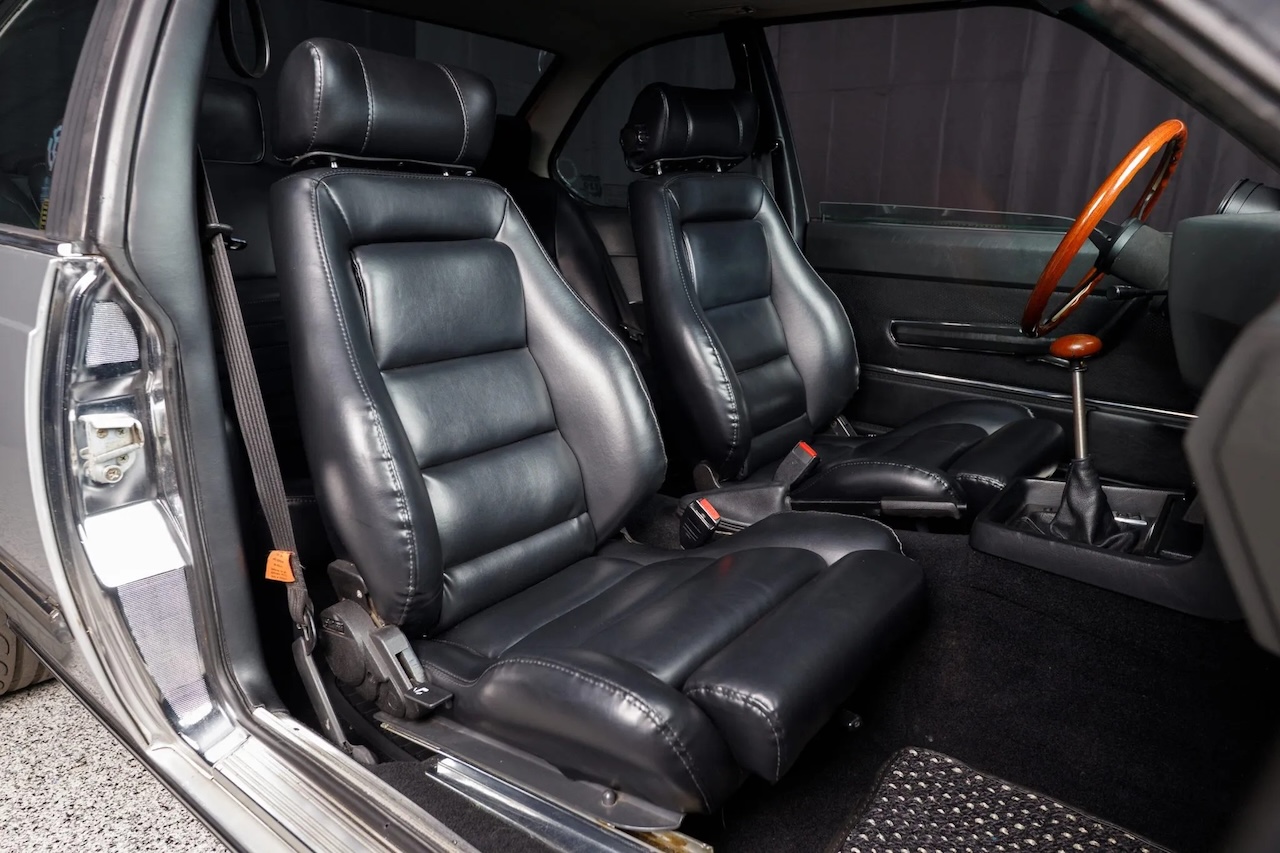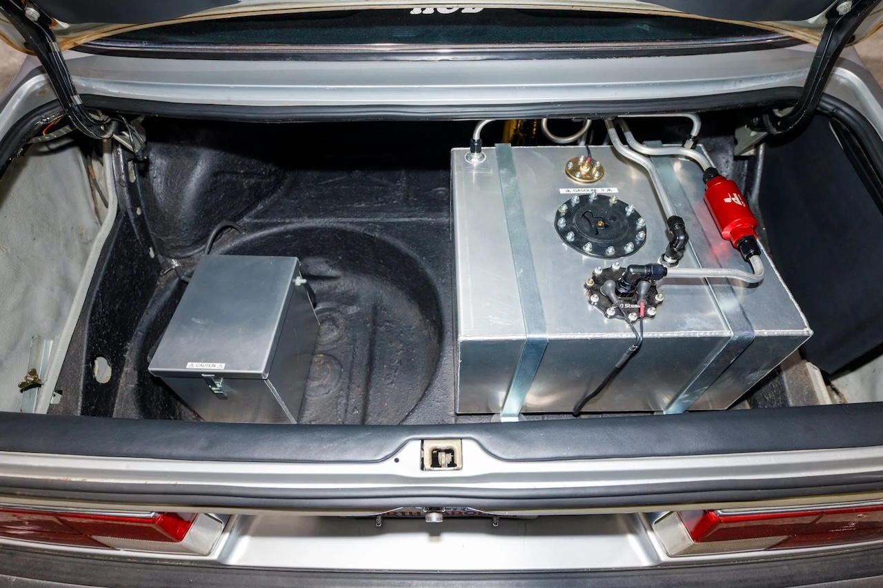 Dedans, c’est la même… classe, mais sans pour autant oublier la touche perso qui va bien. Les baquets Scheel sont tendus de cuir noir d’une finition semblable à une housse de siège auto d’origine pendant que des tapis Coco habillent le sol. Le volant Nardi et e pommeau sur mesure sont en bois. Le levier de vitesse a été rehaussé et doté d’un short shift. Les copteurs sont adaptés alors qu’un gros compte tour a été rajouté. Trois manos complémentaires ont poussé sur la console centrale et le boitier de gestion a été déplacé dans la boite à gants. Dans le coffre, on retrouve désormais un réservoir de type racing et la batterie à la place de la roue de secours.