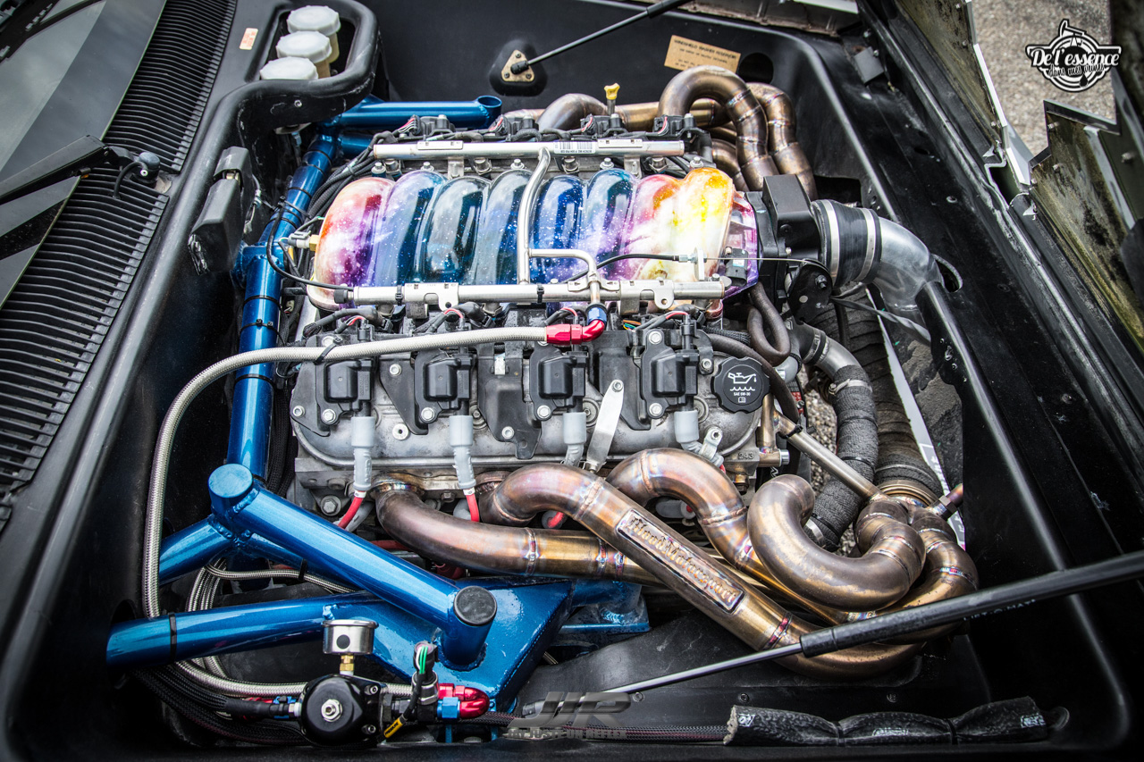 D’après Alex, c’est une des deux seules modifs au monde où une DeLorean se retrouve avec son bloc à l’avant. C’est donc un V8 LS 6.2 L issu d’une Chevrolet Camaro qui sort actuellement 400 ch, aidé par une gestion Fueltech et un magnifique collecteur d’échappement sur mesure by Bloodmotorsports.