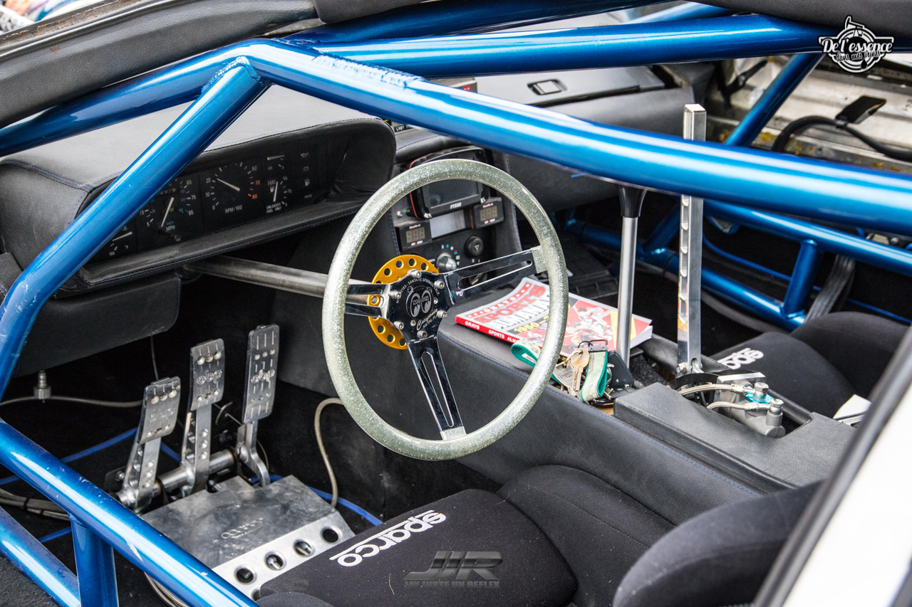 Dedans on retrouve un rollcage complet avec deux baquets, une colonne de direction sur mesure ainsi qu’un frein à main hydraulique et un Pedal Box de chez OBP. Bien-sûr Alex s’est laissé aller à quelques fantaisies comme un convecteur temporel ou encore un tableau de bord de l’espace temps ! Dehors… Mais dehors putain ! C’est la DeLorean la plus violente que j’ai vue ! Un kit large sur mesure prend place, avec une lame avant et un béquet à la duck-tail dessiné par Corsa 801 vient rendre l’ensemble plus méchant. On trouve même le support de Overboard !