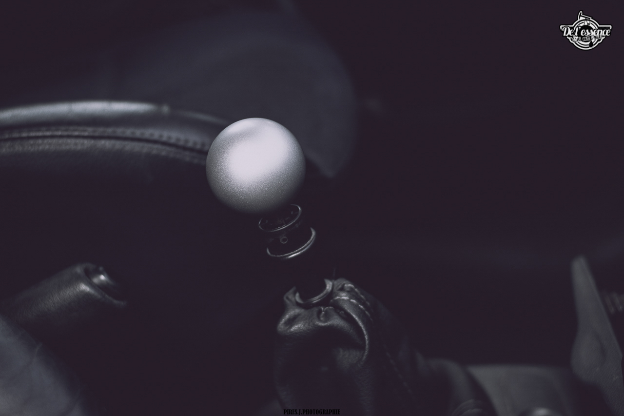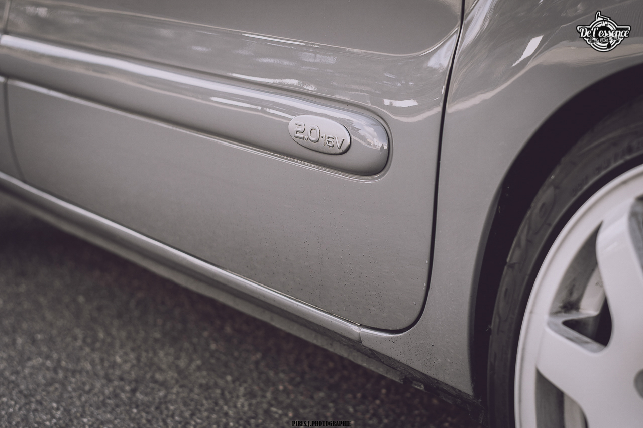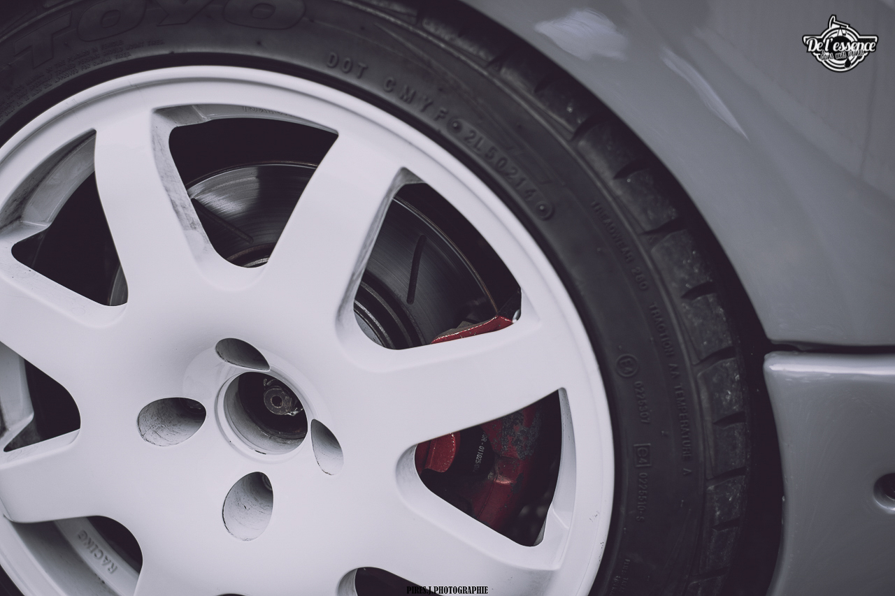 Pour commencer, il a fallu revoir le plumage. Anthony a visé dans le mille, sans tomber dans l’excès. Sahcant que tout est 100 % « Anthomade », tout droit sorti de son cerveau, il a quasiment tout fait, que ce soit au niveau mécanique, technique ou physique, c’est Anthony qui s’est chargé de la transformation. Pare choc de Clio RS à l’avant, feux arrière teintés en noir le tout recouvert d’une magnifique robe gris Nardo. Les ailes ont été tirées afin de laisser passer les jantes Prima Racing Gr.A en 16’ blanches, qui ont nécessité le devis de changement d’un pneu pour finir par les chausser en Toyo de 195/45. Le train avant vient d’une Clio RS 172 alors que celui de l’arrière, d’origine, a été refait à neuf. Le centre de gravité a été rabaissé de 30 mm grâce à des ressorts courts à l’avant et un décrantage à l’arrière. Pour élargir les voies, les jantes arrière ont été posées sur des cales de 20 mm. Enfin, en cas d’optimisme, les freins sont issus d’une Clio RS. On vous arrête de suite… L’objectif n’est ni de s’aligner dans une spéciale, ni d’aller chasser le chrono dans le premier time attack venu. Non, le truc, c’est de rouler différent tout en assurant un bon coup de pub à son garage et son savoir faire… Manifestement, ça marche !
