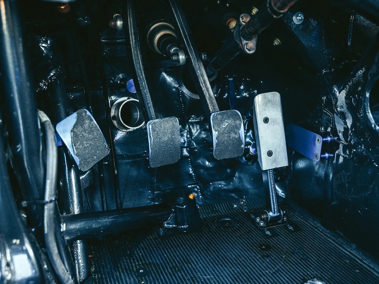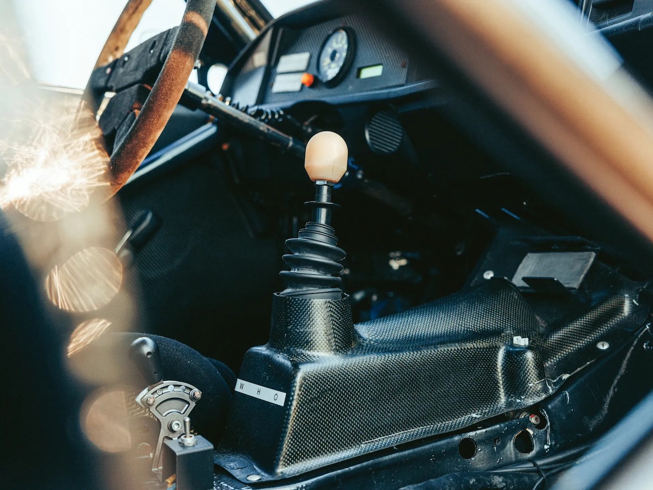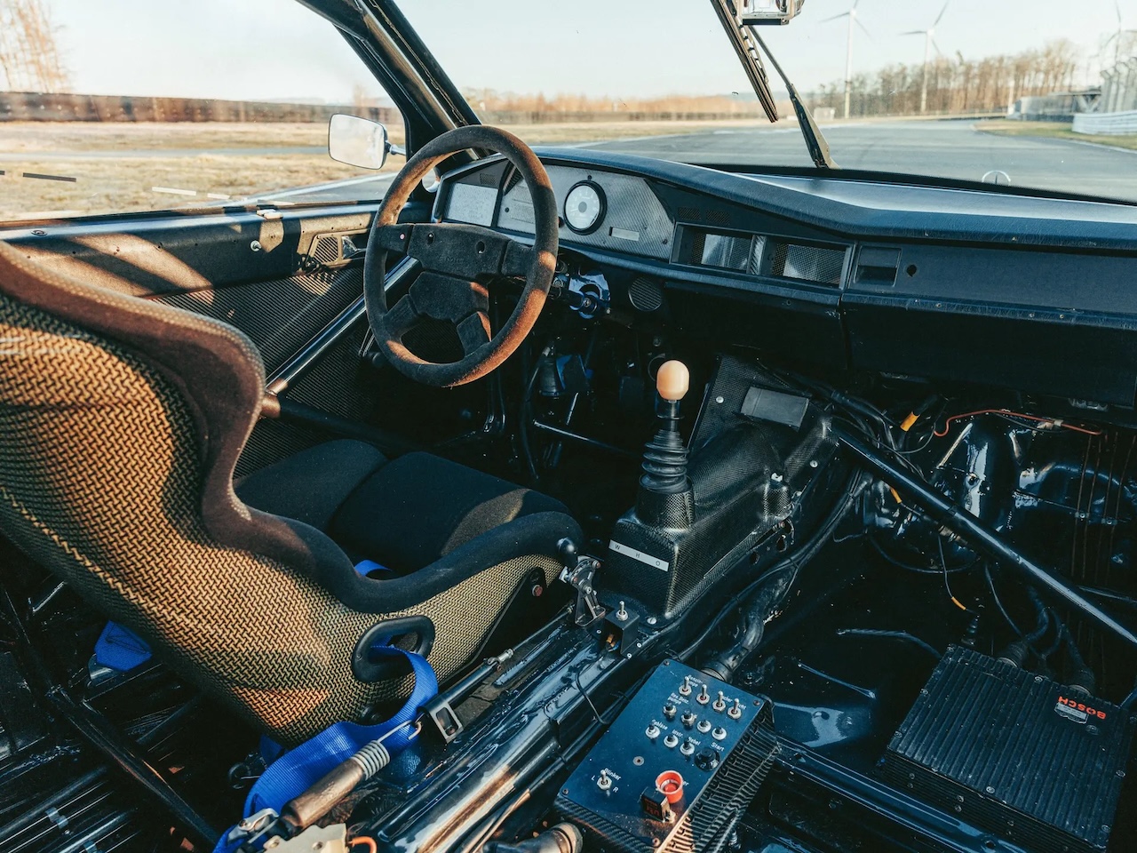 Dans sa dernière évolution, son 4 cylindres 2.5 l 16s avec culasse Cosworth et gestion Motronic affiche 380 ch perchés à 9500 trs. Associé à une boite 6 manuelle et un différentiel réglable, il se contente de trimbaler 980 kg. Bien entendu tout a été rigidifié, renforcé et c’est réglable dans tous les coins. Paradoxalement, sa robe noire et argent la rend presque discrète… j’ai dit presque ! On comprend maintenant l’importance du kit qui vient muscler l’Evo 2. Le règlement était clair. Tu homologuais la « base » avec 5000 stradales commercialisées, ici la 190 2.5 16 et tu pouvais à partir de là, homologuer une Evolution plus puissante, plus radicale et plus musclée avec une version routière commercialisée à 500 exemplaires… ici les Evo 1 et Evo 2. Mais aussi les Sierra RS500 ou M3 Sport Evo.