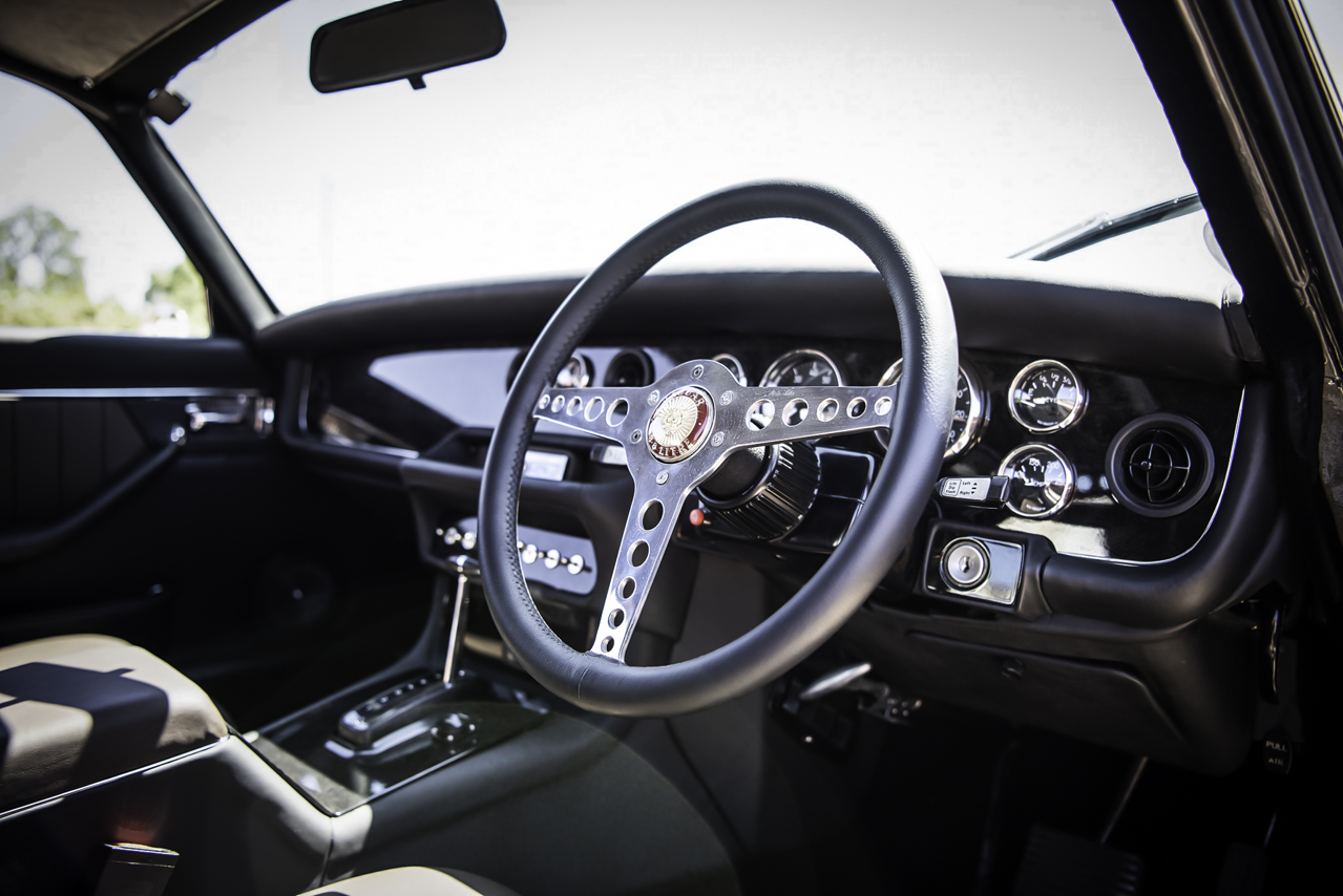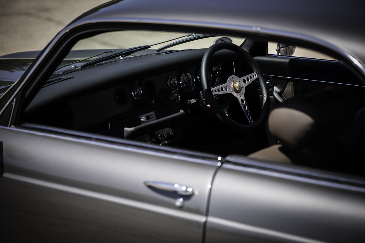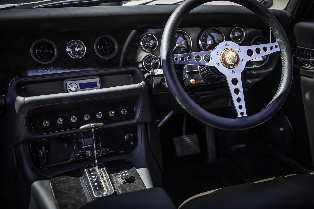 Alors, où on en est ? Look, châssis, bloc… ce XJC restomod n’en serait pas un sans un vrai habitacle digne d’un cocon où se côtoient cuir Connolly couleur tabac et noir, ronce de noyer sombre et tout un troupeau de moutons noirs sous vos pieds ! Ajoutez y une sono Alpine, des touches d’alu, de chrome, notamment sur le volant Motolita (emprunté à une Type E mais modifié pour recevoir une jante plus large), le levier de boite d’origine, une batterie de commutateurs et de manos ainsi qu’un bouton de démarrage directement gaulé à un Submarine Spitfire !
