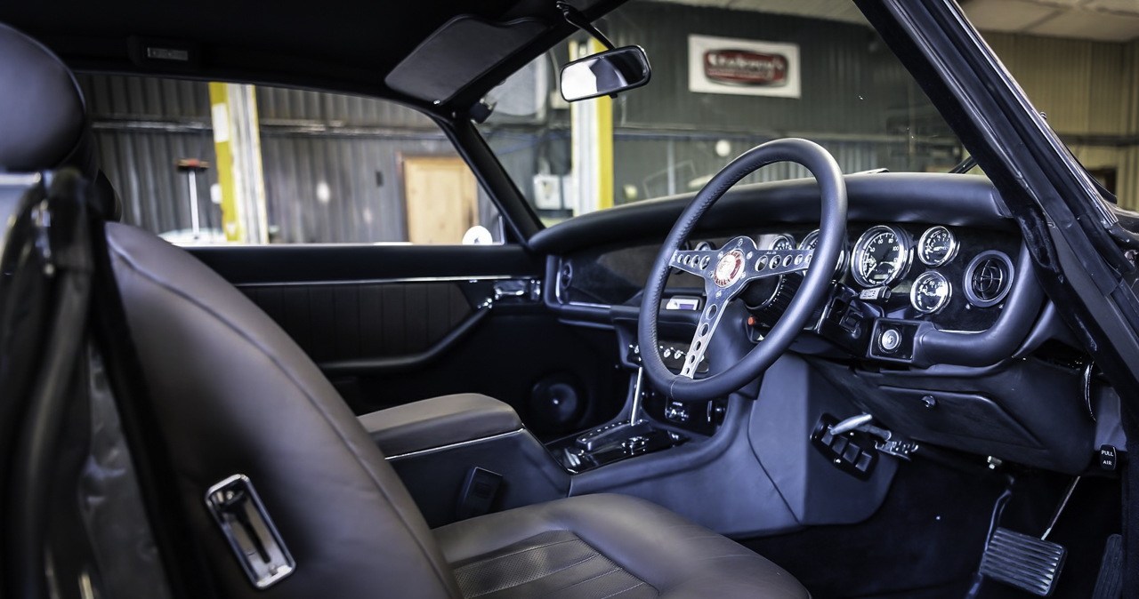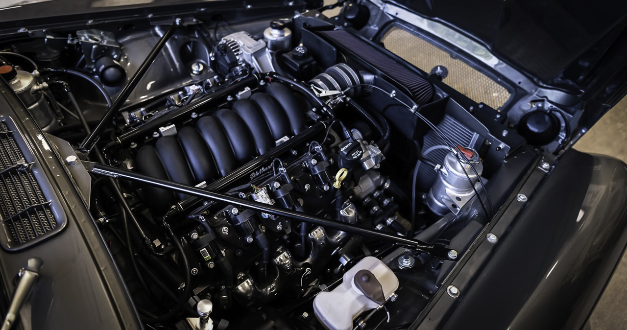Quand vous levez le capot, oubliez le V12 d’origine. Ne vous attendez pas non plus à retrouver un 6 en ligne. Le gazier n’est maintenant plus originaire de Coventry mais de Détroit. Bah, quitte à coller des jantes ricaines, pourquoi ne pas aussi y flanquer un V8 ? En l’occurrence un LS3, puissant, disponible neuf à un tarif correct, facilement upgradable et fiable. ‘Fin sous le capot de la XJC, pas besoin d’aller y chercher des noises, c’est pas le but, puis avec ses 430 ch, il y a déjà largement c’qu’il faut. Allez, juste un nouvel ECU Nomex et un allumage Edelbrock pour le laisser tourner à l’alcool. Surtout que la Jag’ a de quoi stocker avec ses deux réservoirs (spécificité du V12).