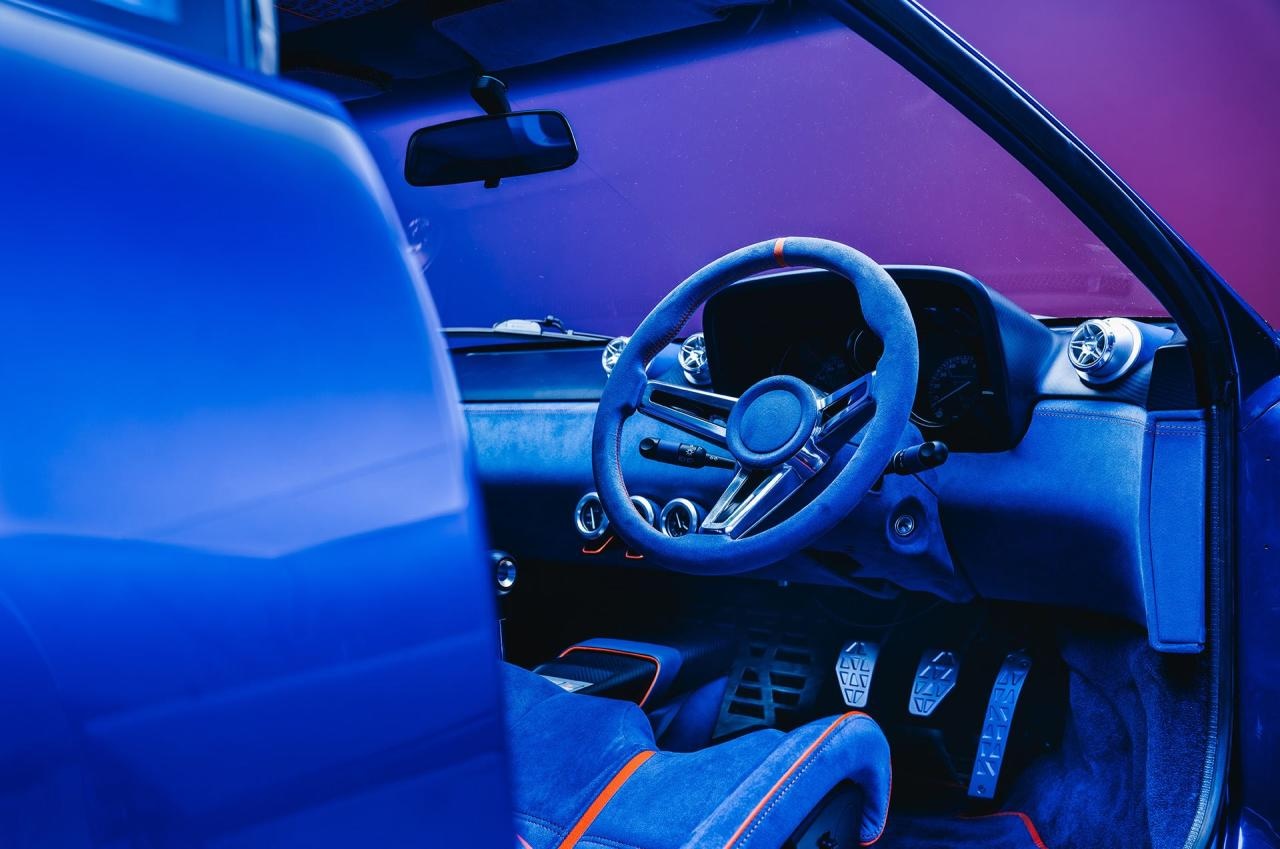 La carrosserie ? En carbone, avec un dessin revu chez Callum qui se charge de moderniser l’original avec un éclairage LED et d’y apporter un peu plus d’aération… et un peu plus de muscles puisque les voies ont été élargies de 77 mm devant et 66 mm derrière. En effet, les trains roulants ont été redessinés et renforcés par un procédé appelé Carbon Fusing, qui consiste à fusionner du carbone à la structure d’origine, de quoi augmenter la rigidité torsionnelle de 23% avant d’y ajouter de nouveaux triangles, tirants et moyeux puis de revoir les points d’ancrage, pour une géo réglable et une direction plus directe. Une nouvelle suspension 3 voies réglable, pilotée électroniquement et développée spécialement pour elle par Tractive, se charge de maintenir tout ça. Les silent-blocs sont passés au polyuréthane. Pour le freinage, c’est Brembo qui a fourni des étriers GT à 6 pistons devant et 4 pistons derrière, pour mordre des disques percés… et si le client le souhaite, un pack carbone céramique est dispo en option. Pour finir avec le grip, la belle est chaussée en 19″ forgées avec des Michelin Pilot Sport 4S en 235/35 et 305/30. Pourquoi pas des Cup 2 ? L’équipe d’Evoluto a souhaitait conserver le côté joueur de la berlinette…