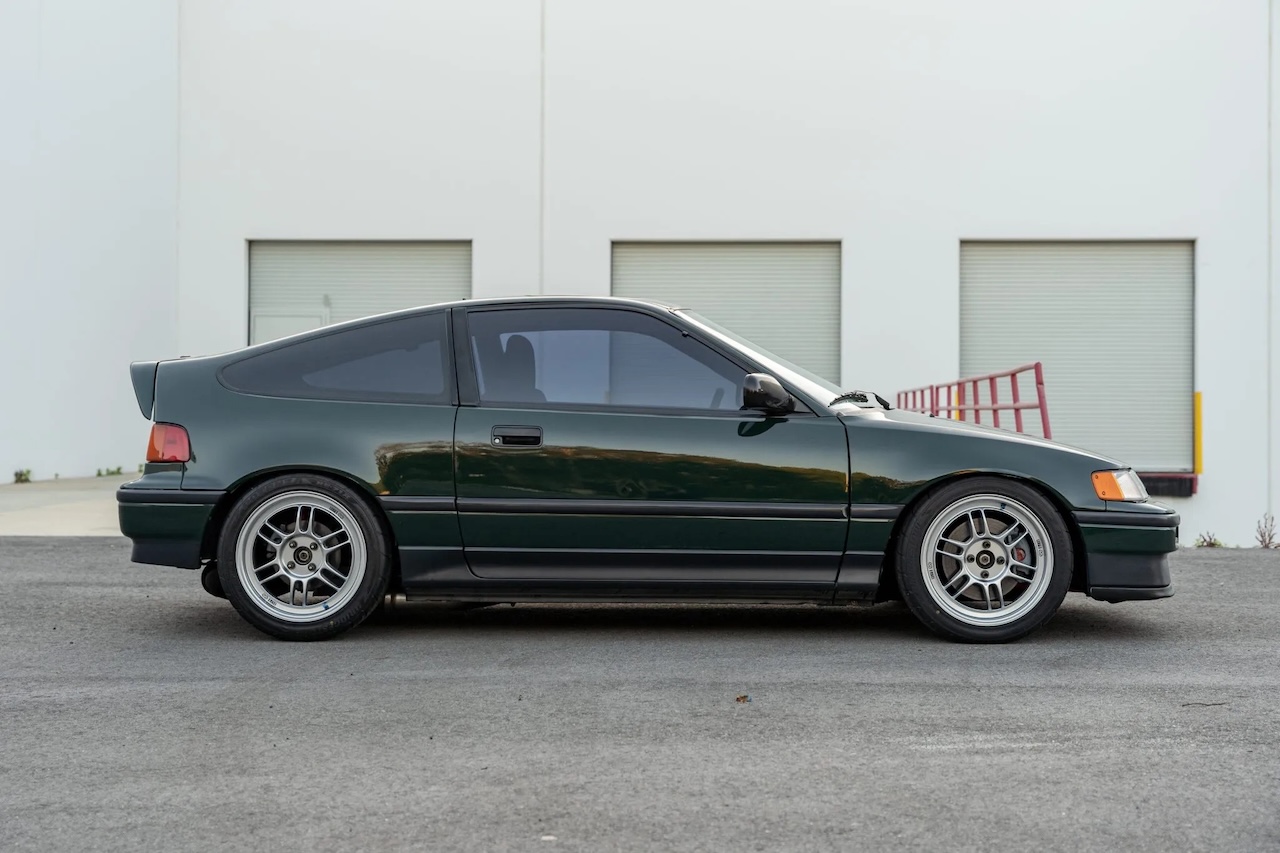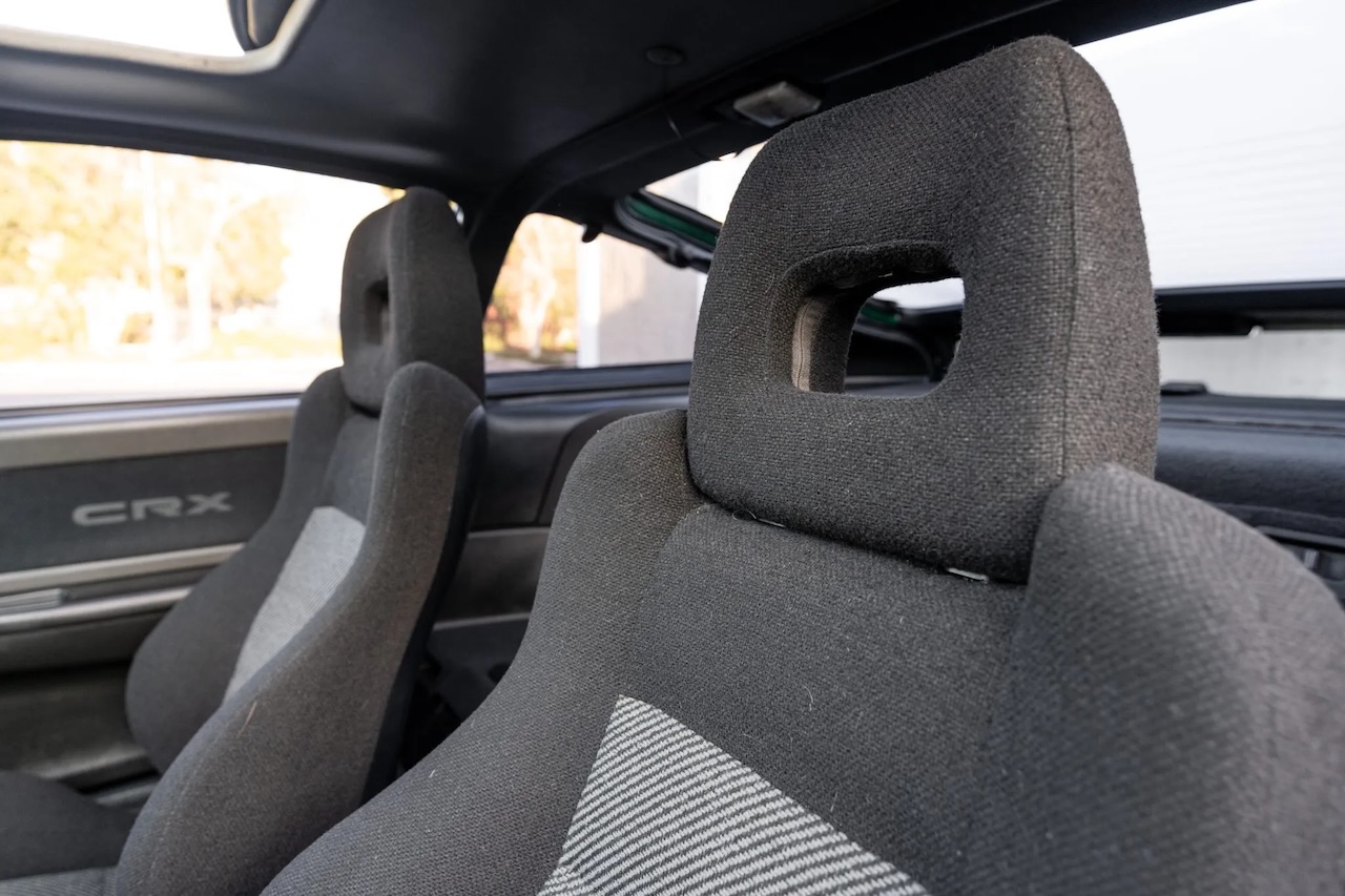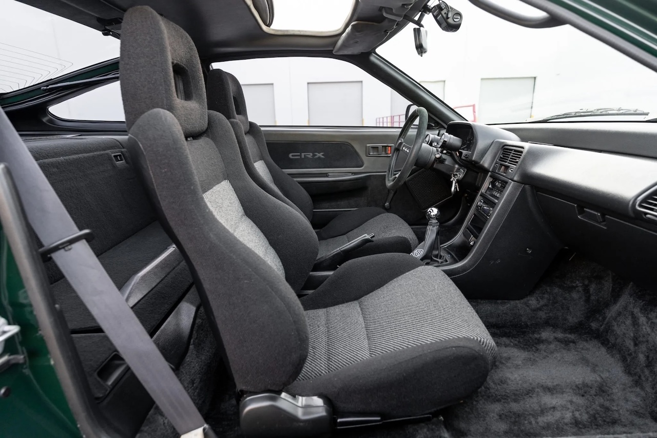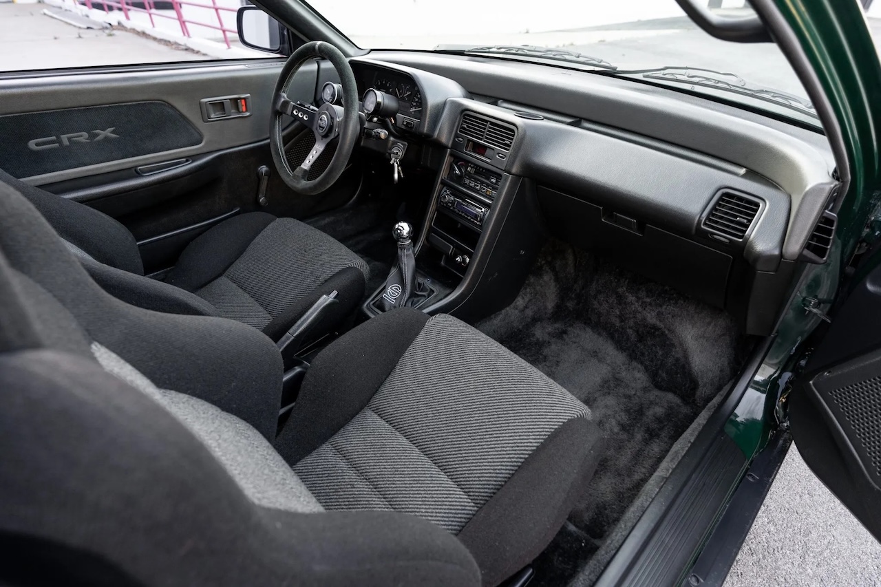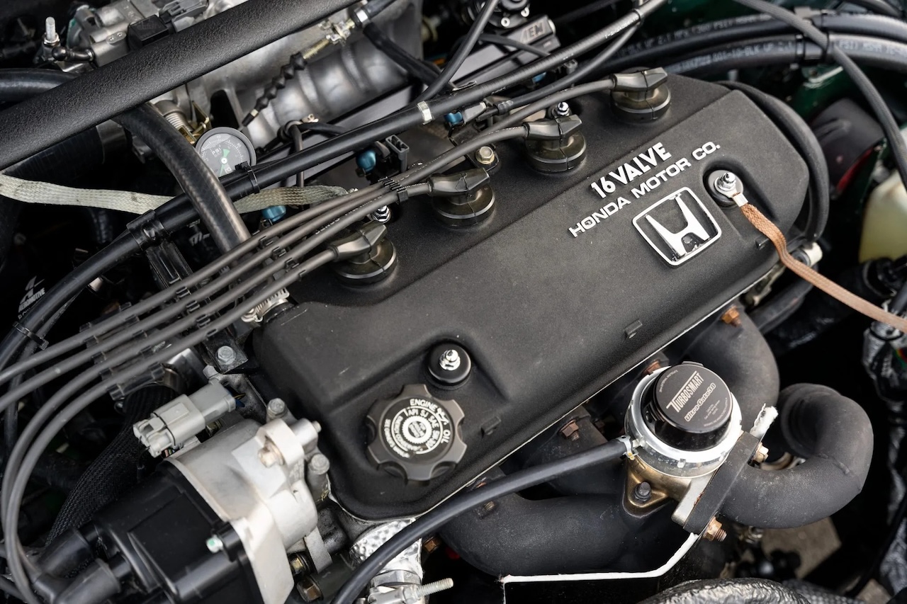 A l’époque, Honda savait encore contenir le poids sous la tonne (950 kg), avant d’y glisser sous le capot, des bouilleurs énervés. Sur la génération qui nous intéresse aujourd’hui (la 2ème) c’était D16 ou B16. Un 1.6 l 16s ou son frangin dopé au Vtec. Oui, il y avait des moteurs moins excités, mais qui ne se vendaient quasiment pas… en même temps quand tu te promènes dans une telle bouille, c’est pas pour t’afficher avec 60 ch entre les roues avant. Le D16 en offrait 130 perchés à 6800 trs quand le B16 passait à 150 ch et prenait 7600 trs ! De quoi donner le tournis… à partir du moment où t’y tapais dans l’fond. Et encore, ça c’était au Japon et en Europe. Aux USA, on devait se contenter du 1.6 l 16s éco… La CRX Si devait se démerder avec 105 ch et 136 Nm à 4800 trs. Au pays des muscle cars, ça faisait tâche… mais comme c’est aussi le pays du swap et d’la greffe d’organe, forcément, ça allait donner naissance à des projets bien barrés !