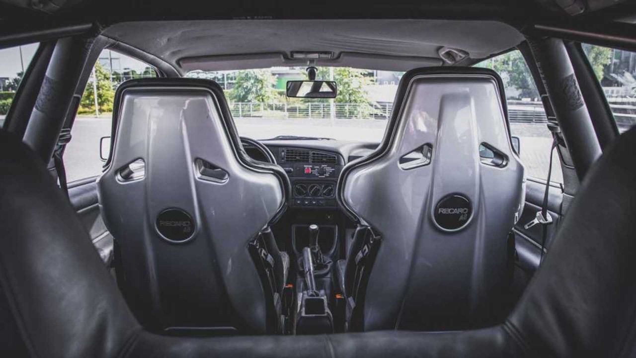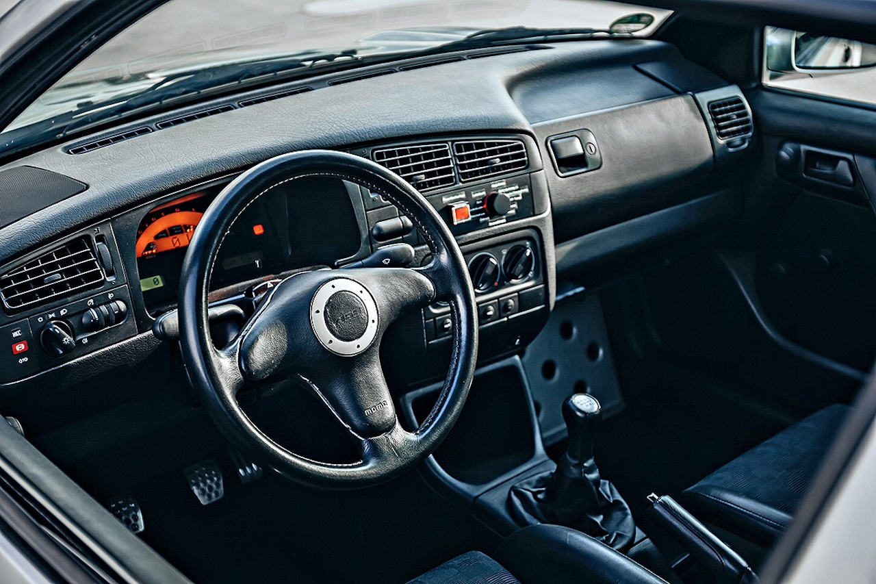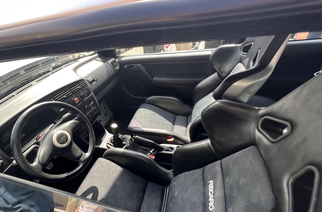 Pour le plumage, les gars n’y sont pas allés avec le dos de la bielle ! La Golf est habillée d’un kit en carbone kevlar avec extensions d’ailes, pare-chocs élargis et aérés, bas de caisse, capot ajouré et aileron au sommet du hayon. Aux 4 coins des Speedline en 16″ sont enrobées de Falken qui se chargent de négocier avec l’asphalte. Dedans, le tableau de bord est conservé, mails il reçoit un dashboard digital, un extincteur et une molette qui permet de checker les différentes infos. Un volant Momo, un pédalier alu avec repose pied pour le passager, deux baquets Recaro et malgré la présence de l’arceau, la banquette arrière, passée en biplace, est conservée.