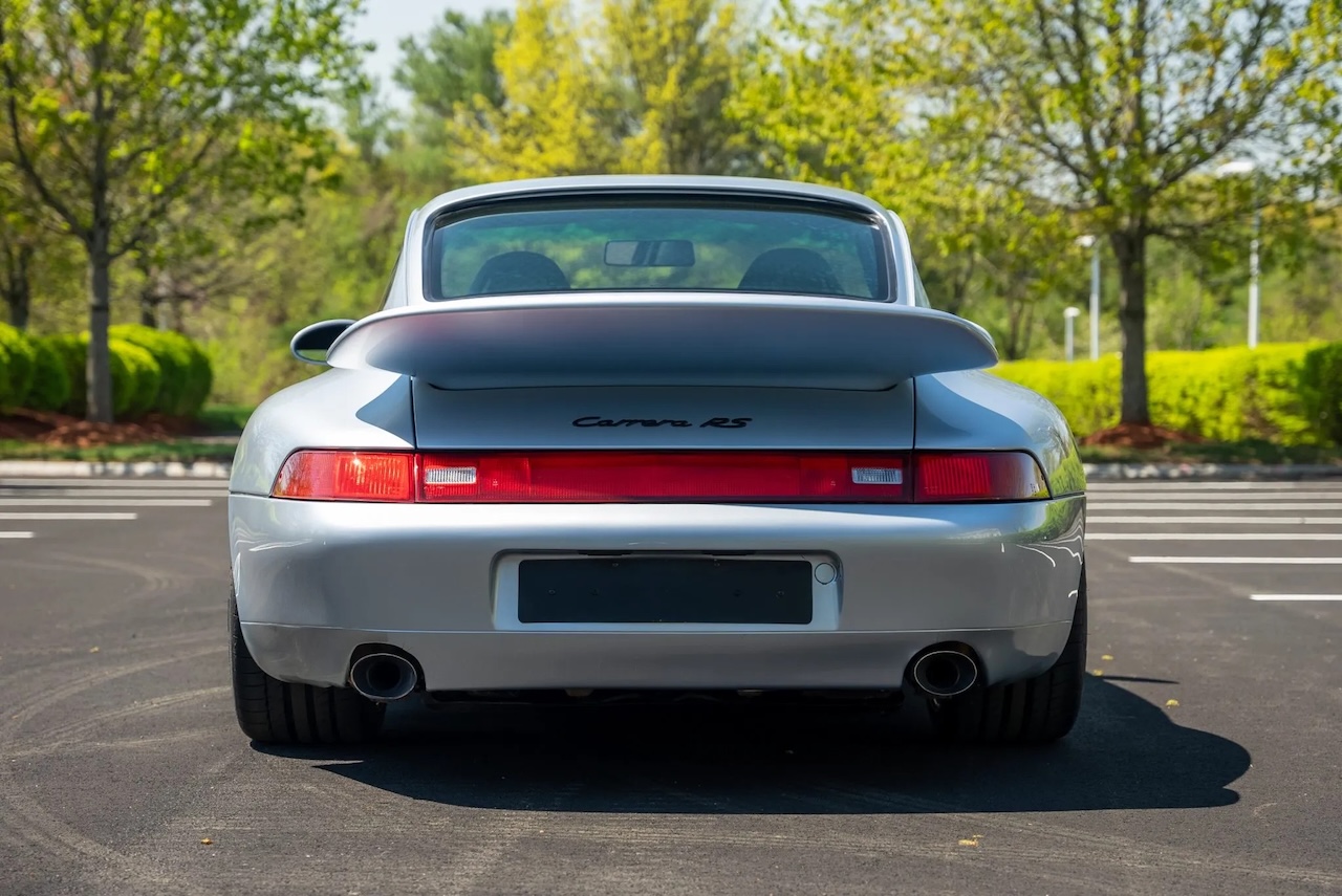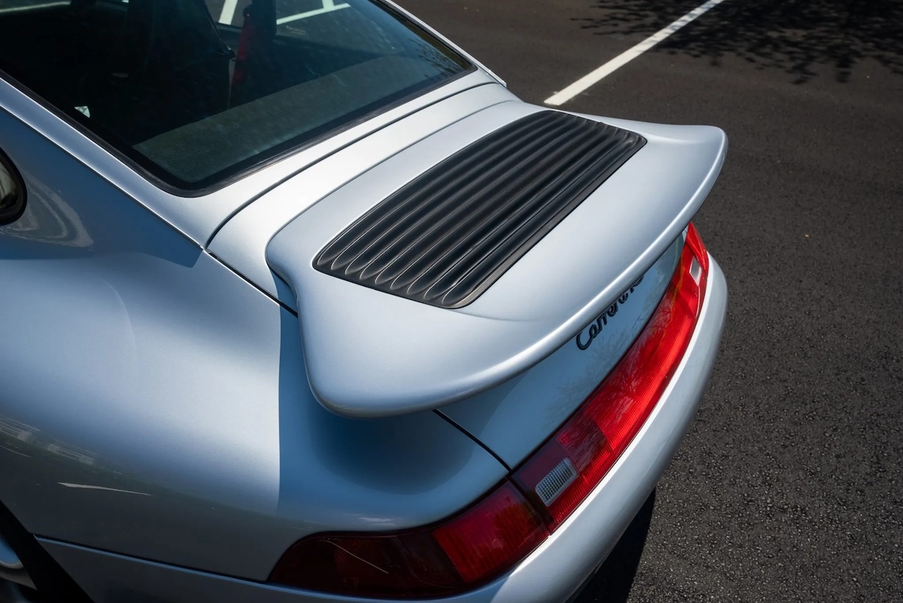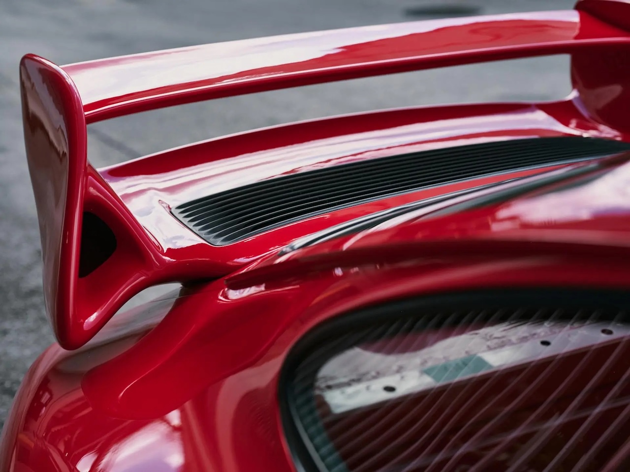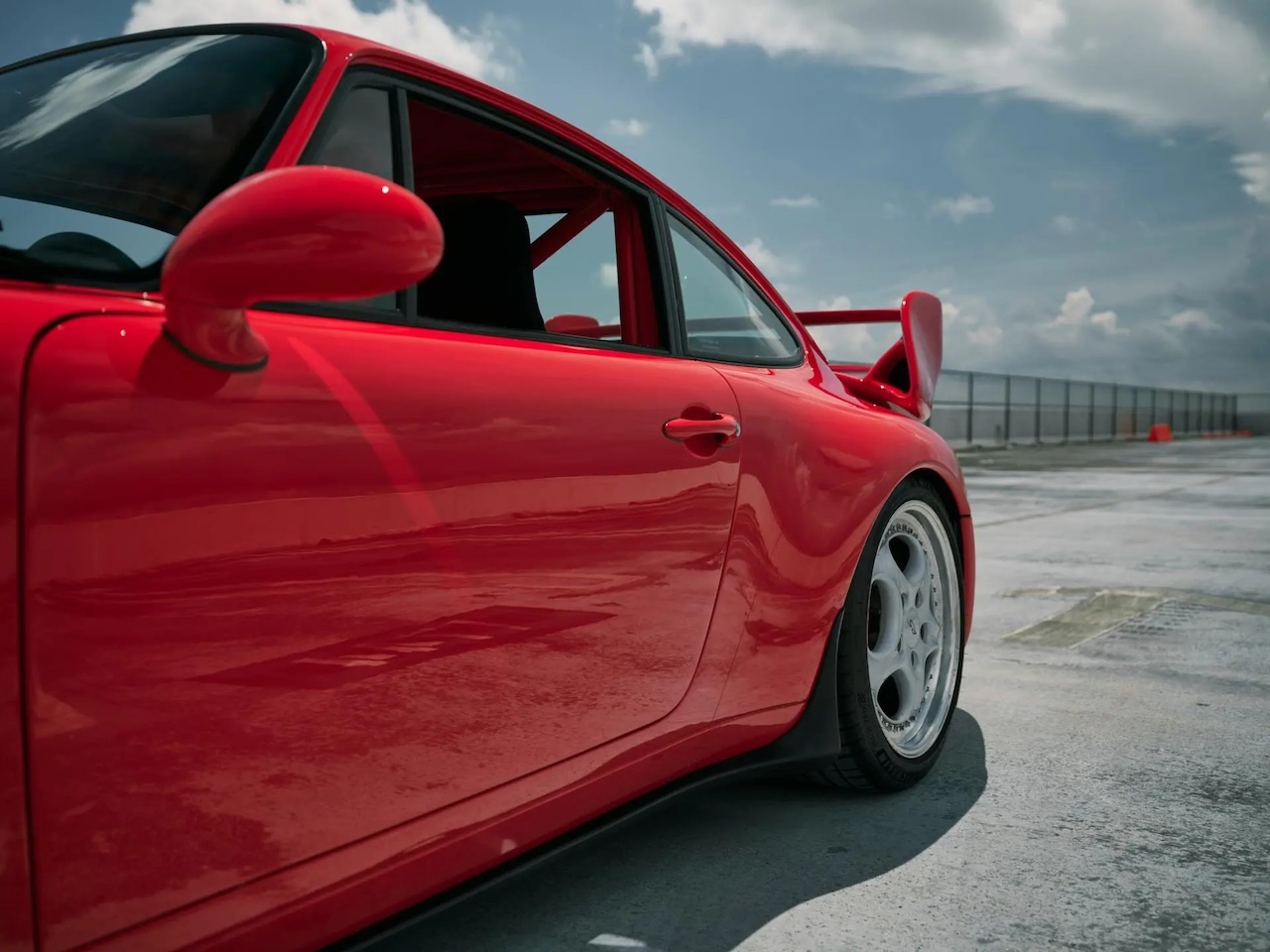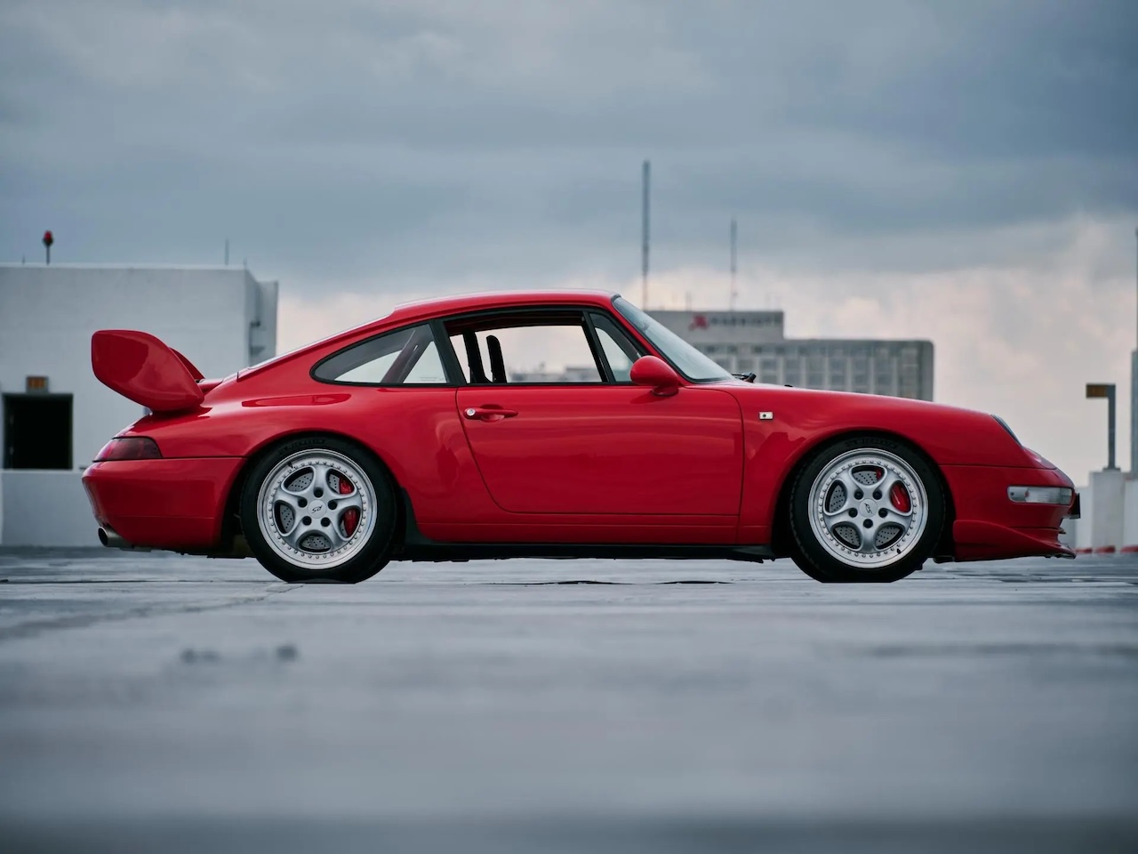 Elle, c’est la compétition qui coule dans ses veines ! Et ça se voit. Si la 964 Carrera RS se contentait d’être affutée mais discrète, la 993 Carrera RS s’est décomplexée et maintenant, elle le montre. Lèvre avant et aileron arrière. Pas la queue de canard mais celle de la baleine. Elle n’embarque pas le cul fat de la Turbo, et même si elle semble se contenter de rester étroite, ses ailes avant ont été légèrement élargies afin d’accueillir les Speedline 3 parties de 18″ chaussées en 225/40 et 265/35. Derrière, les étriers 4 pistons et les disques percés viennent de la Turbo. Au niveau des trains roulants, les double triangulation sont maintenues par des suspensions Bilstein plus basses et plus raides. Les barres stab’ et antiroulis sont plus grosses et maintenant réglables. L’avant est monté en Unibal. Les coupelles d’amotos reçoivent des platines afin de régler le carrossage et chasse. Les biellettes de direction sont renforcées et une barre anti-rapprochement vient renforcer le train avant.