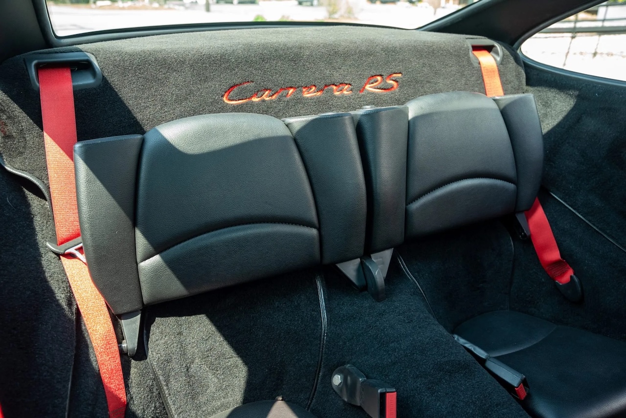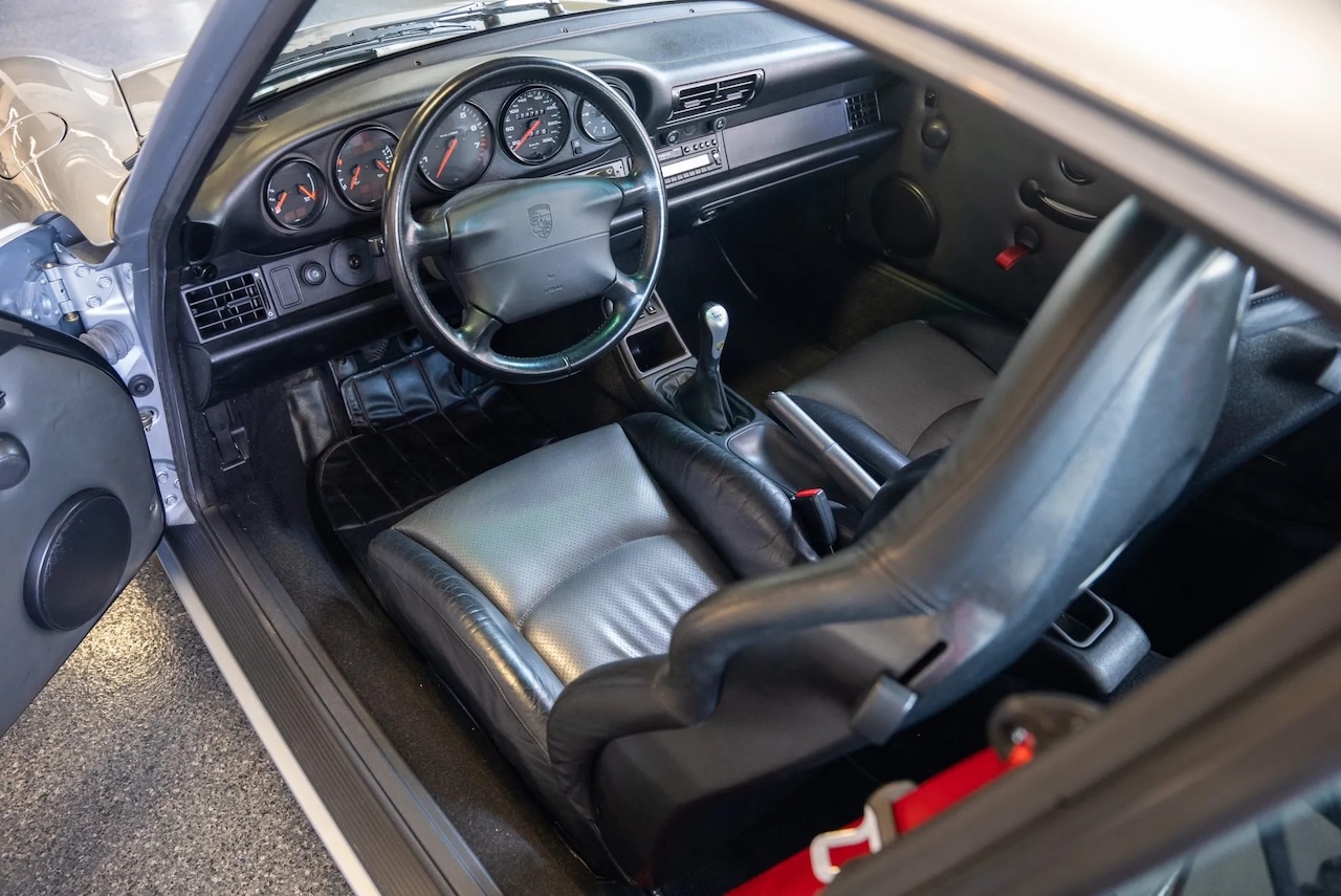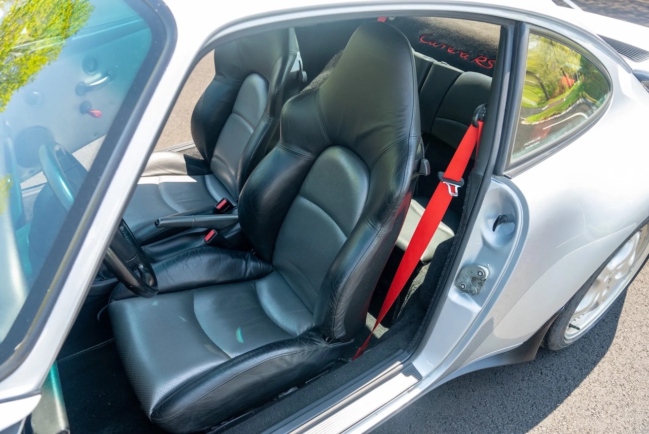 300 ch ? Oui, mais plutôt énervés et associés à un régime sec. Plus de radio, plus de HP, plus de rétros élec, plus de sièges arrière, plus d’allumage de plafond, plus de moquette épaisse, plus de dégivrage arrière… même le mode intermittent des essuie-glaces a été supprimé ou encore le réservoir du lave glace passé à 1.2 l au lieu de 6 l ! On retrouve aussi des vitres plus fines, un capot alu, des panneaux de portes spécifiques avec ouverture à lanière, un volant et levier de vitesse allégés… sur la balance, c’est 100 kg de perdus… enfin de gagnés…! Du coup, avec 300 ch pour 1270 kg, la 993 Carrera RS mange le 0 à 100 en 5 secondes, passe le 400 m en 13,2, la borne en moins de 24 avant de filer à plus de 270 compteur… mais on s’en branle ! Les chronos en ligne droite, c’est pour la Turbo… avec la Carrera RS, le chrono, c’est en mode spéciale et bien sinueuse s’il vous plait !