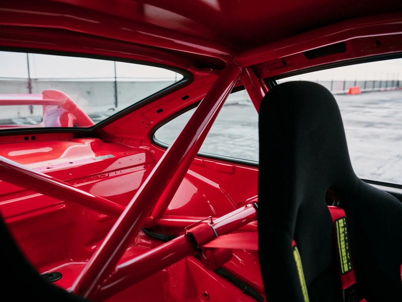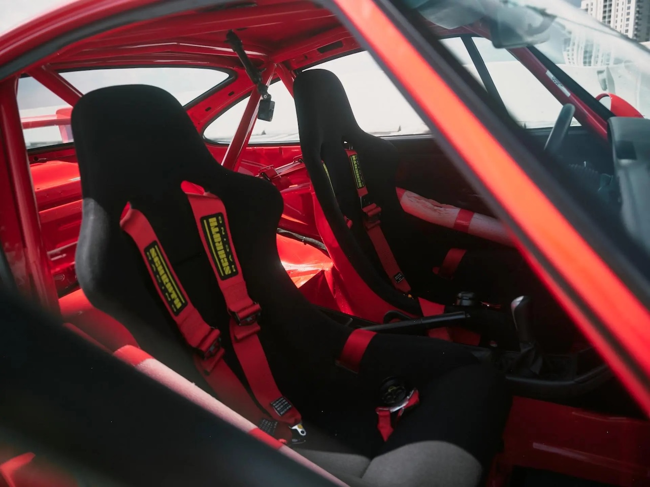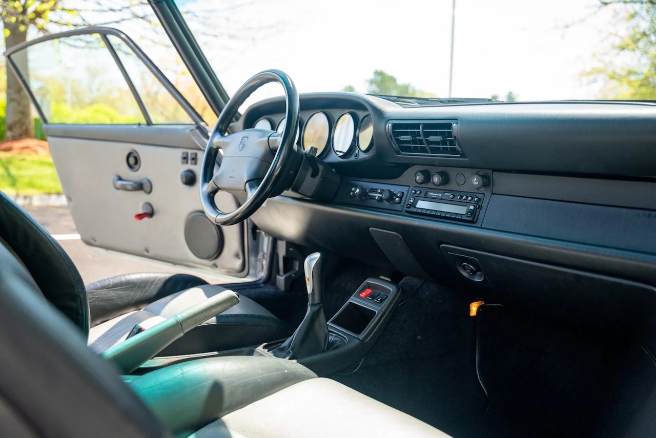 300 ch ? Oui, mais plutôt énervés et associés à un régime sec. Plus de radio, plus de HP, plus de rétros élec, plus de sièges arrière, plus d’allumage de plafond, plus de moquette épaisse, plus de dégivrage arrière… même le mode intermittent des essuie-glaces a été supprimé ou encore le réservoir du lave glace passé à 1.2 l au lieu de 6 l ! On retrouve aussi des vitres plus fines, un capot alu, des panneaux de portes spécifiques avec ouverture à lanière, un volant et levier de vitesse allégés… sur la balance, c’est 100 kg de perdus… enfin de gagnés…! Du coup, avec 300 ch pour 1270 kg, la 993 Carrera RS mange le 0 à 100 en 5 secondes, passe le 400 m en 13,2, la borne en moins de 24 avant de filer à plus de 270 compteur… mais on s’en branle ! Les chronos en ligne droite, c’est pour la Turbo… avec la Carrera RS, le chrono, c’est en mode spéciale et bien sinueuse s’il vous plait !
