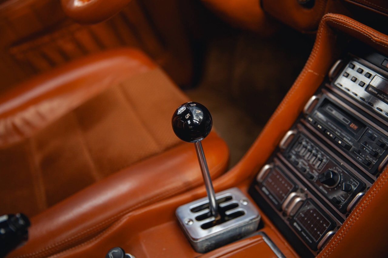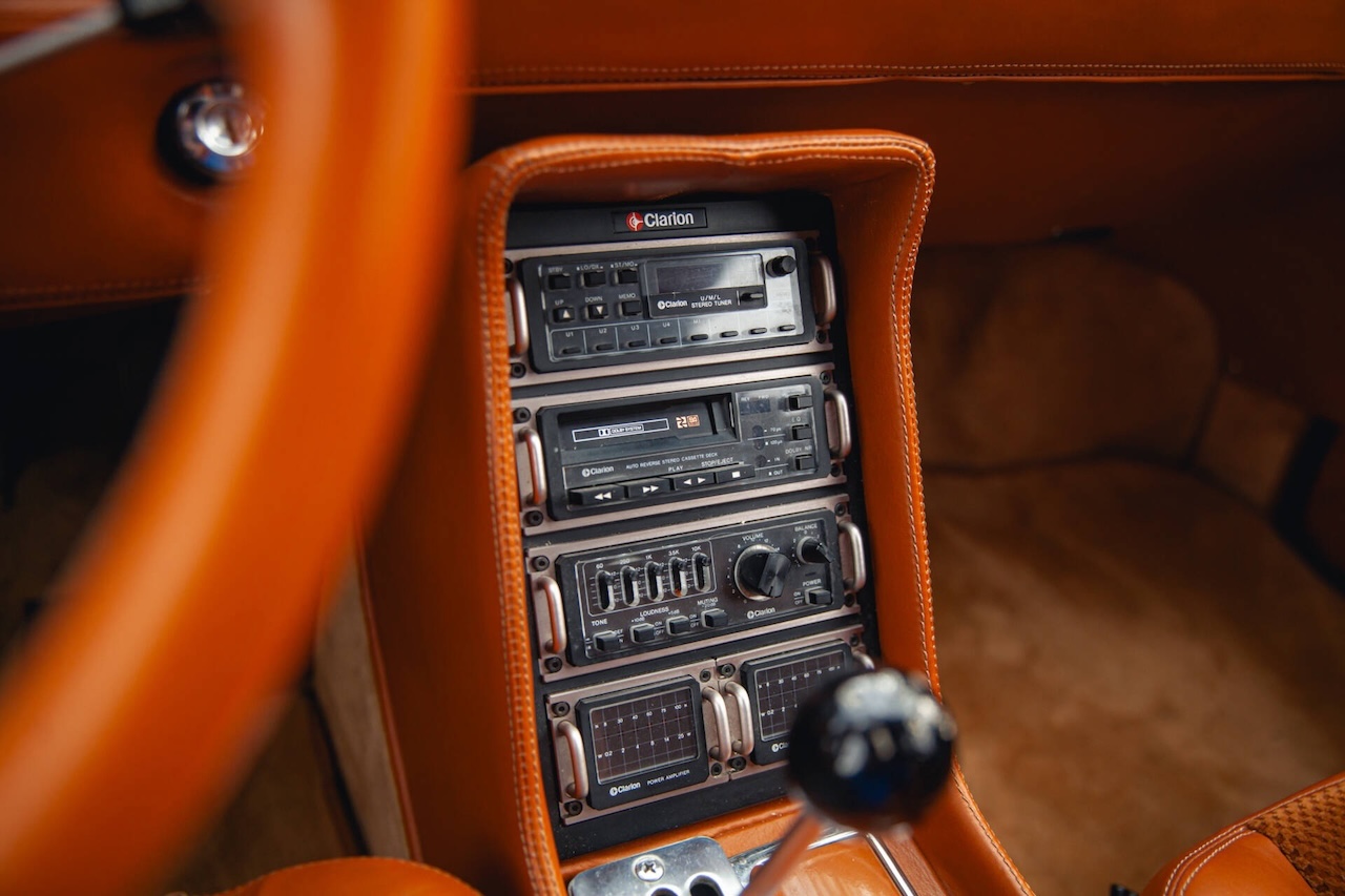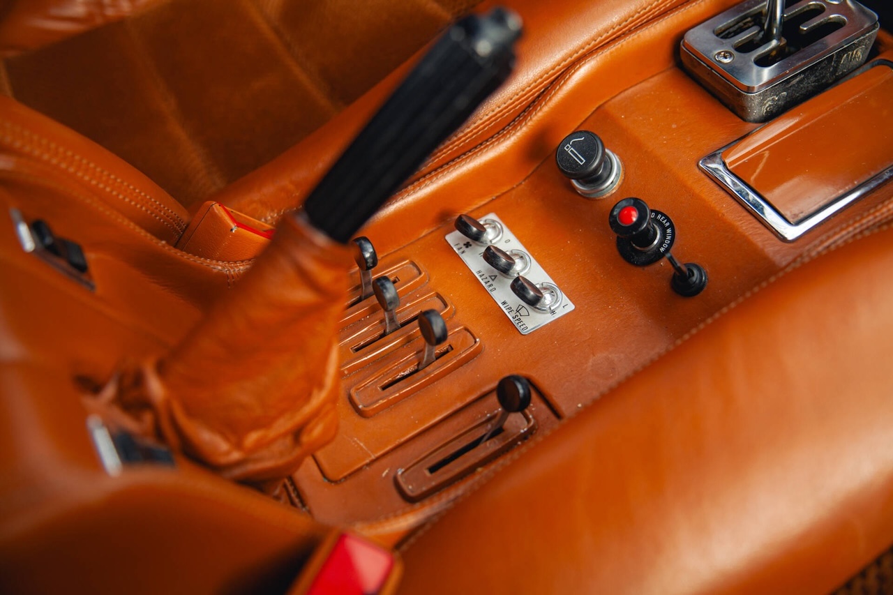 L’habitacle aussi a largement pioché dans la sportive italienne. Le tableau de bord est incliné et modifié pour se marier avec une large console centrale équipée d’une chaine Hifi et d’un ordinateur de bord. Les panneaux de portes viennent aussi de la 308 tout comme les sièges, entre lesquels trône le célèbre levier de vitesse et sa grille. Tout ce qui peut l’être est tendu de cuir caramel et de moquette crème. La finition est superbe, à rendre jalouse la Ferrari donneuse d’organe !