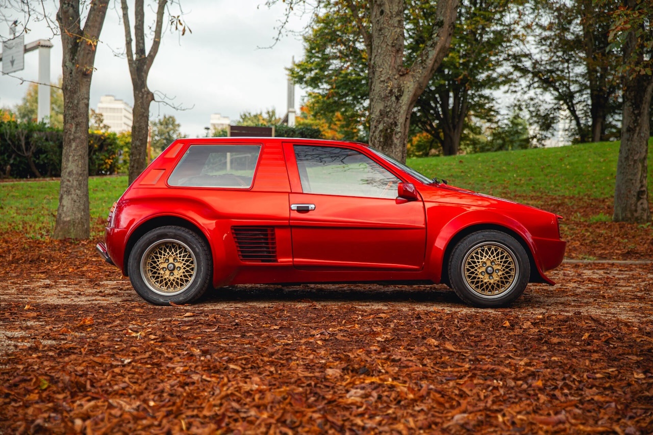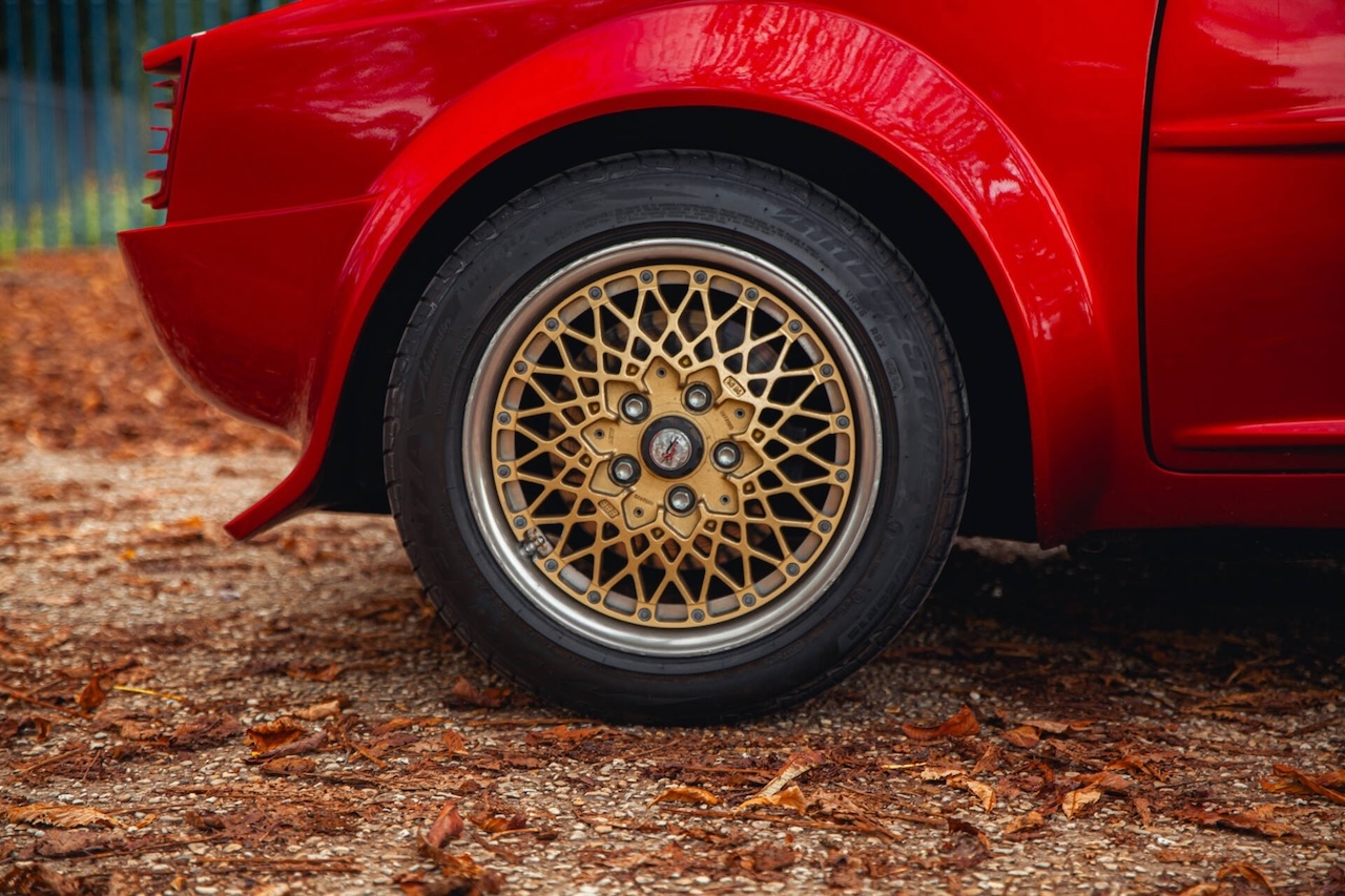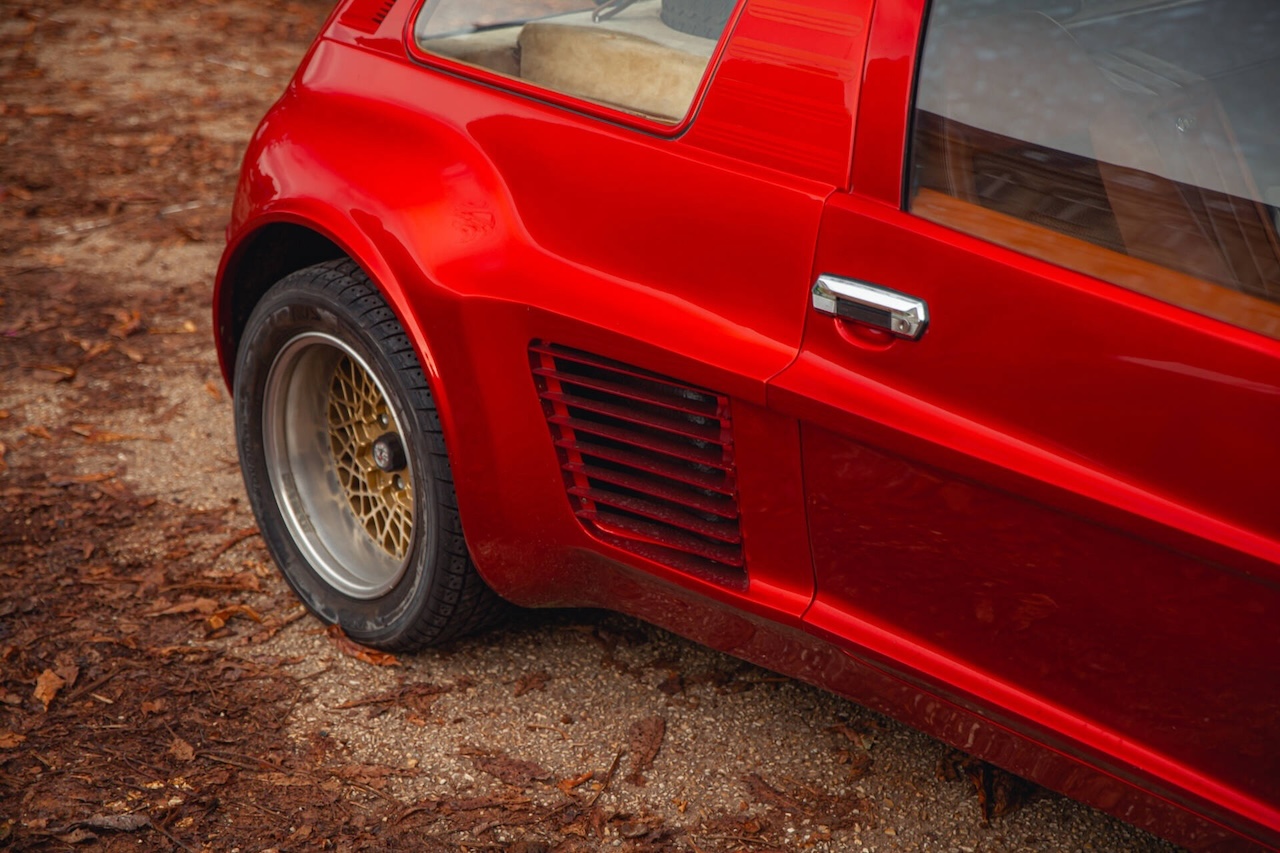 L’ensemble est habillé par une caisse en polyester. On peut trouver quelques ressemblances avec une Fiat Uno hypertrophiée. Sauf que la petite italienne ne sortira qu’en 83. Il s’agit donc bien d’une création tout droit sortie de l’imagination de Franco. En attendant, la caisse affiche seulement 3m10 de long soit seulement 4cm de plus que la Mini. Par contre, niveau largeur, ça pique ! 1m75 quand la petite anglaise revendique 1m40. La faute a ses laaaaarges hanches échancrées… là encore, qu’on pourrait croire inspirées par la Testarossa… alors qu’elle ne sortira qu’en 84 ! Aux quatre coins, on retrouve des Gotti, en 15″ devant et 16″ derrière, chaussées en Pirelli P7.