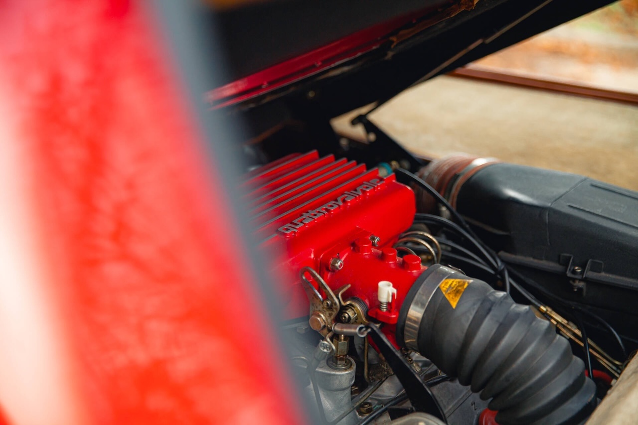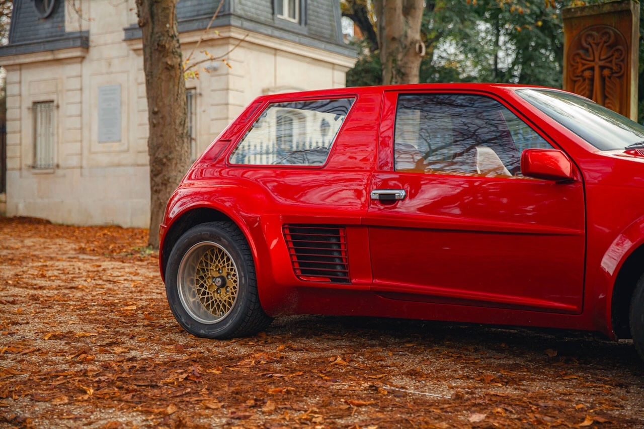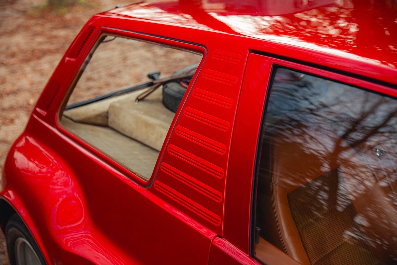 L’ensemble est habillé par une caisse en polyester. On peut trouver quelques ressemblances avec une Fiat Uno hypertrophiée. Sauf que la petite italienne ne sortira qu’en 83. Il s’agit donc bien d’une création tout droit sortie de l’imagination de Franco. En attendant, la caisse affiche seulement 3m10 de long soit seulement 4cm de plus que la Mini. Par contre, niveau largeur, ça pique ! 1m75 quand la petite anglaise revendique 1m40. La faute a ses laaaaarges hanches échancrées… là encore, qu’on pourrait croire inspirées par la Testarossa… alors qu’elle ne sortira qu’en 84 ! Aux quatre coins, on retrouve des Gotti, en 15″ devant et 16″ derrière, chaussées en Pirelli P7.